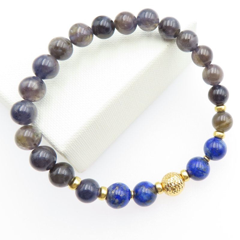 Bransoleta z lapis lazuli i iolitem w złoconym srebrze 925 przyciąga wzrok głębokimi odcieniami granatu oraz subtelnymi, chłodnymi tonami fioletu. Naturalny rysunek kamieni tworzy elegancki, a jednocześnie swobodny efekt, który dobrze łączy się ze złoconym akcentem.