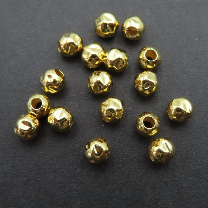 Ozdobna kulka młotkowana w kolorze złota, wykonana ze srebra złoconego 24K (próba 925). Powierzchnia o fakturze młotkowanej daje subtelny połysk i „iskrzenie” w świetle, dzięki czemu element wygląda dekoracyjnie mimo niewielkiego formatu.