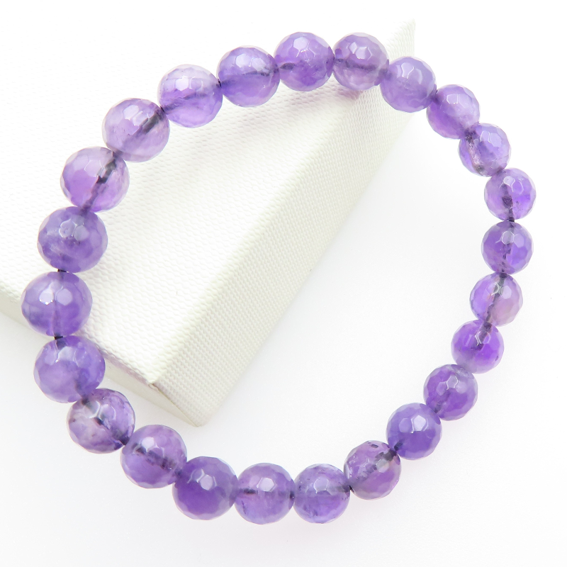 Bransoleta z naturalnego ametystu fasetowanego, wykonanego w formie kulek, przyciąga uwagę głębokim fioletem i subtelnym połyskiem uzyskanym dzięki szlifowi. Kamienie tworzą rytmiczną, elegancką kompozycję o wyraźnie jubilerskim charakterze, a elastyczna forma podkreśla wygodę noszenia.