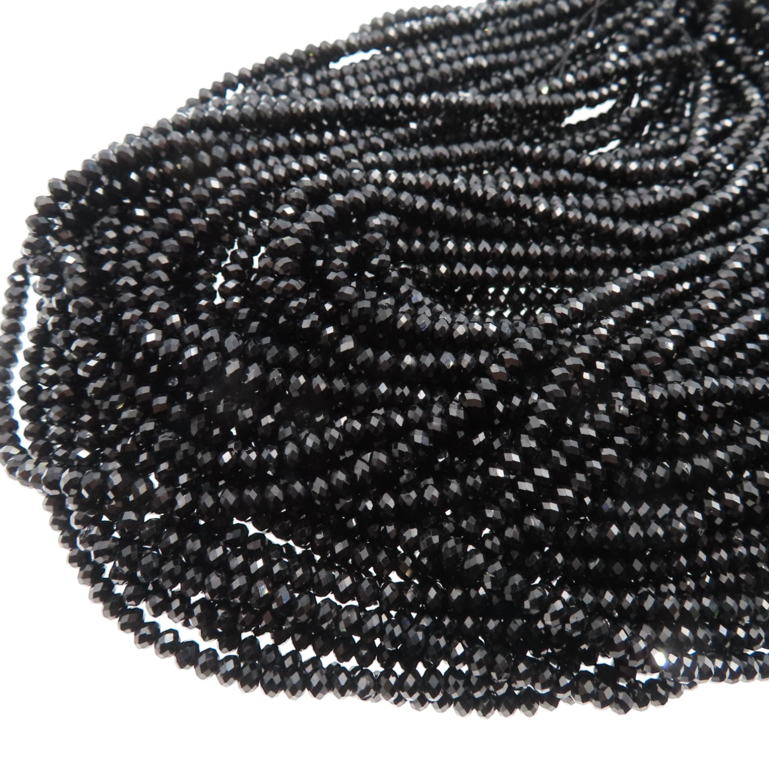 Naturalny spinel w głębokim, czarnym kolorze w formie fasetowanych oponek. Drobne fasety ładnie łapią światło, dzięki czemu kamienie wyglądają elegancko i „jubilersko”, mimo niewielkiego formatu.