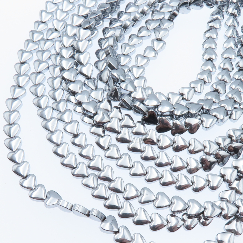 Naturalny hematyt srebrny w formie kulek-serce o średnicy około 6 mm, nawleczony na sznur o długości około 40 cm. Kamienie prezentują metaliczny srebrny połysk i gładką powierzchnię, co nadaje biżuterii elegancki i nowoczesny charakter.