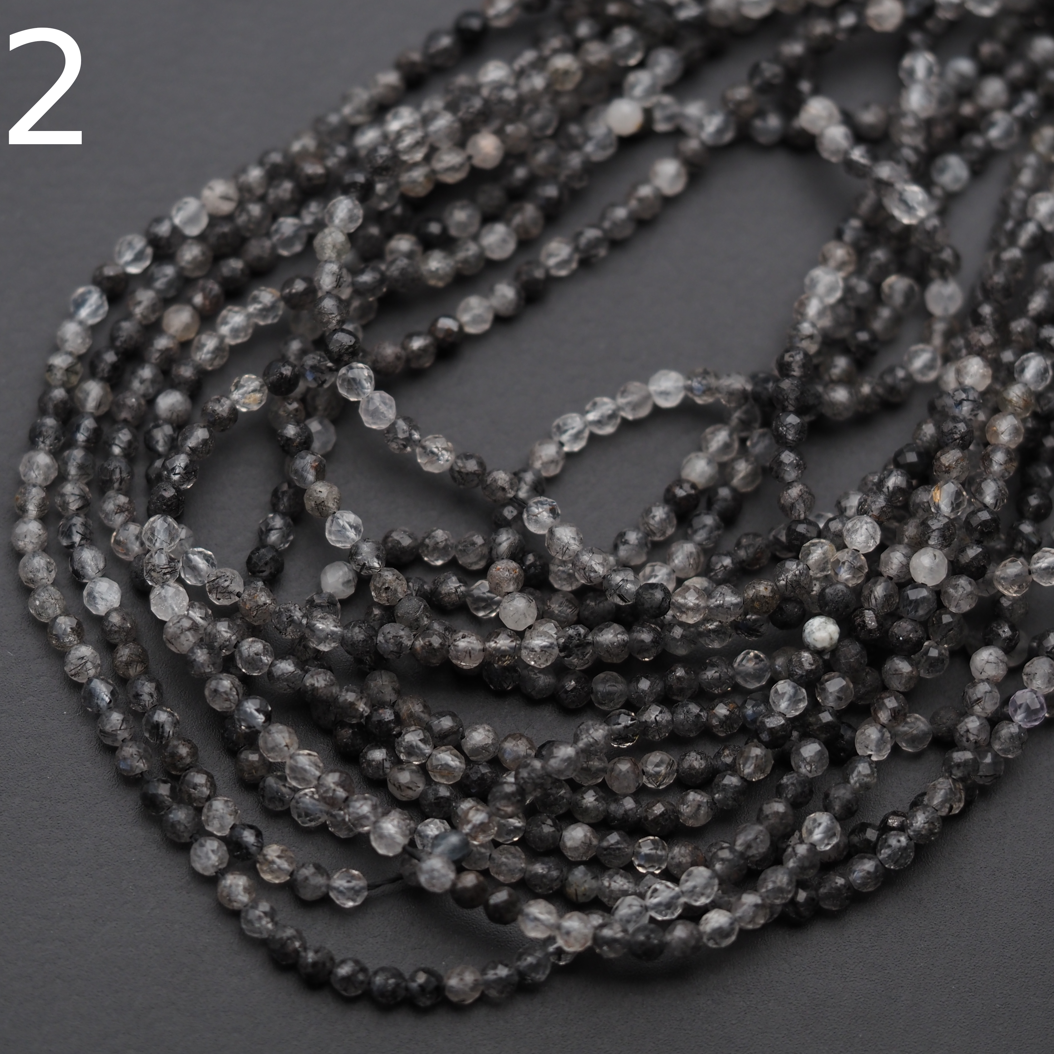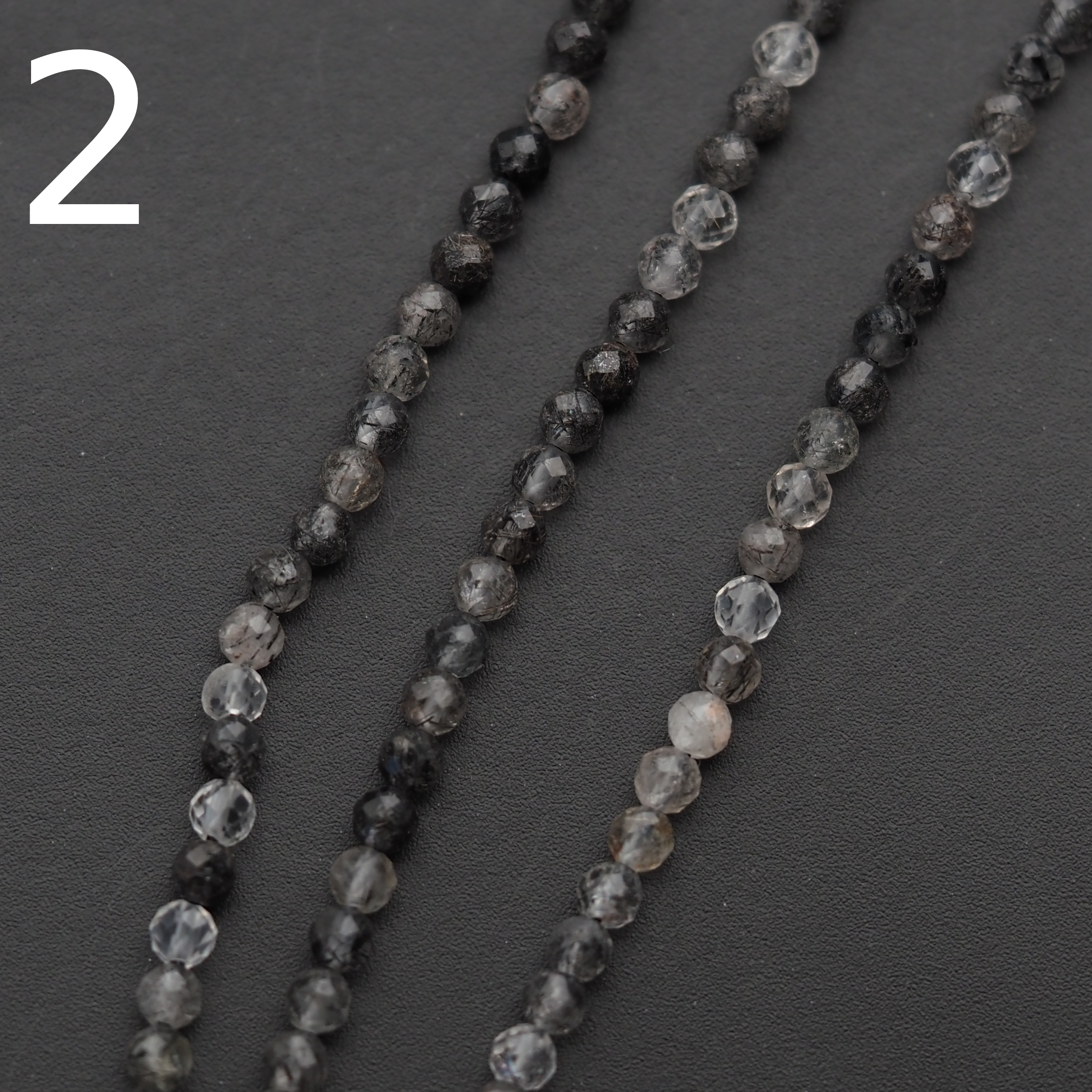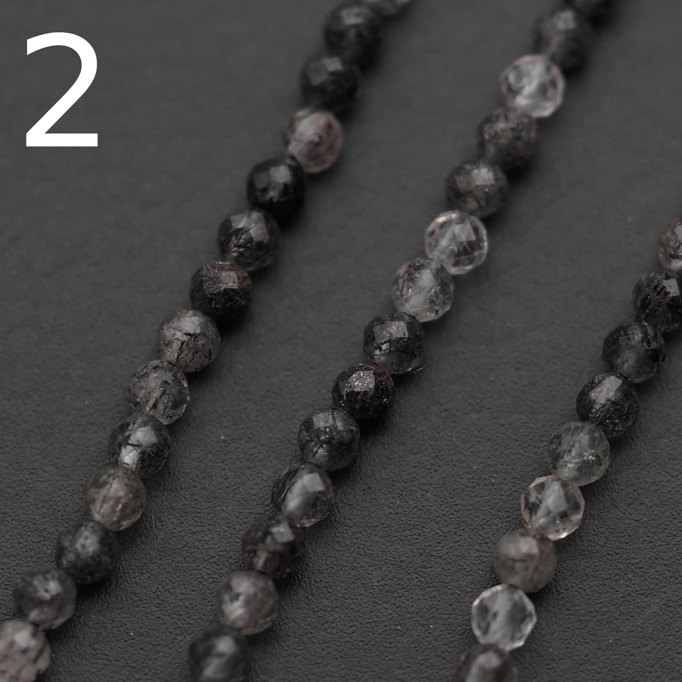 Kwarc rutylowy czarny to wyjątkowy kamień naturalny, ceniony zarówno w jubilerstwie, jak i w świecie ezoteryki. Prezentowany produkt to drobne, fasetowane kulki o średnicy ok. 2,5 mm, nawleczone na sznur o długości 39 cm. Przezroczysta baza kwarcu z widocznymi, czarnymi inkluzjami rutylu tworzy elegancki, kontrastowy efekt, który pięknie odbija światło dzięki fasetowaniu.