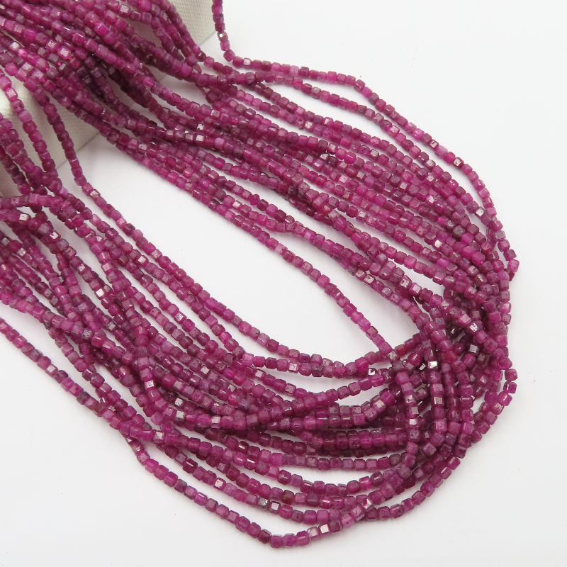 Naturalny rubin w formie drobnych, fasetowanych kostek zachwyca szlachetną, nasyconą czerwienią i eleganckim połyskiem. Regularny kształt i precyzyjne fasetowanie sprawiają, że elementy pięknie „łapią” światło i podkreślają luksusowy charakter projektu.