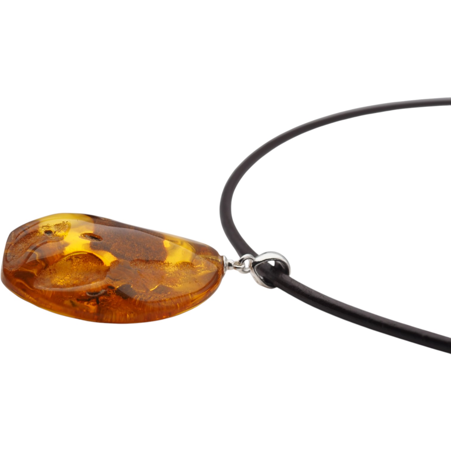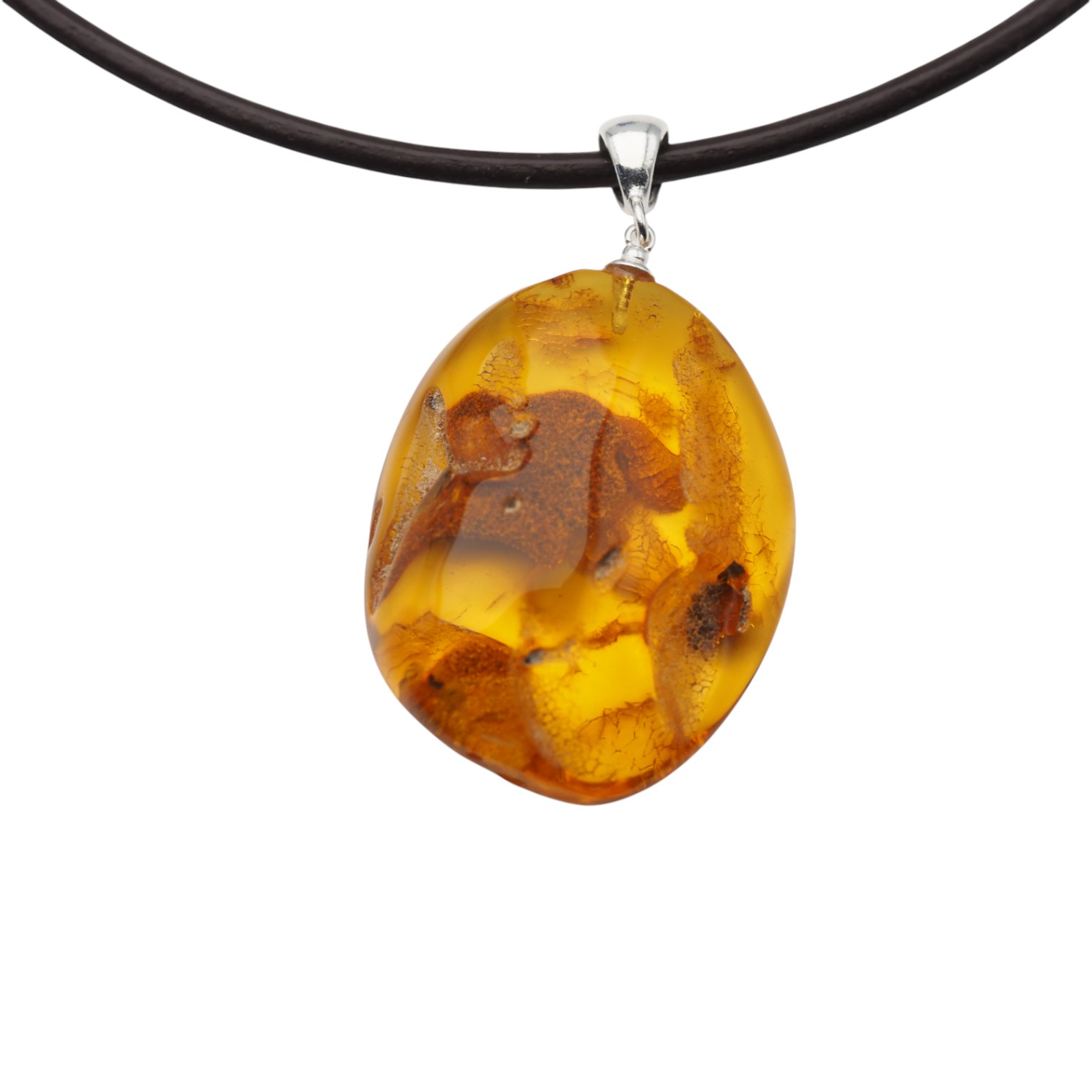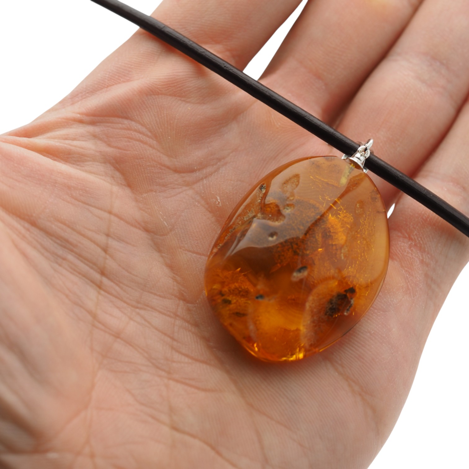 Ręcznie wykonany naszyjnik z naturalnym bursztynem o transparentnym, miodowym odcieniu. W kamieniu widoczny jest zatopiony przed milionami lat odcisk roślinny, który nadaje całości unikatowy, kolekcjonerski charakter. Zawieszka została wykonana ze srebra próby 925, co podkreśla szlachetność i naturalną głębię bursztynu.