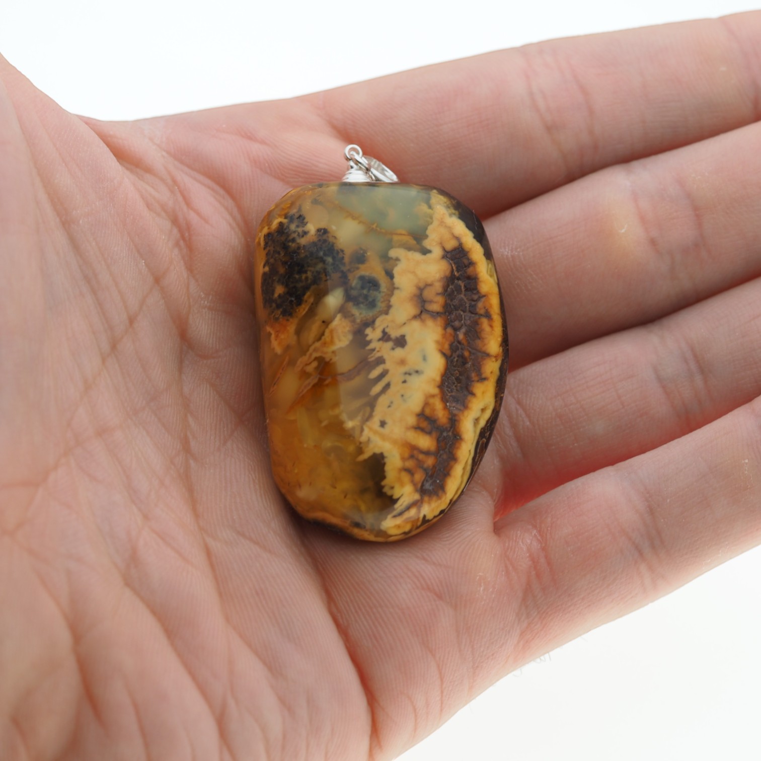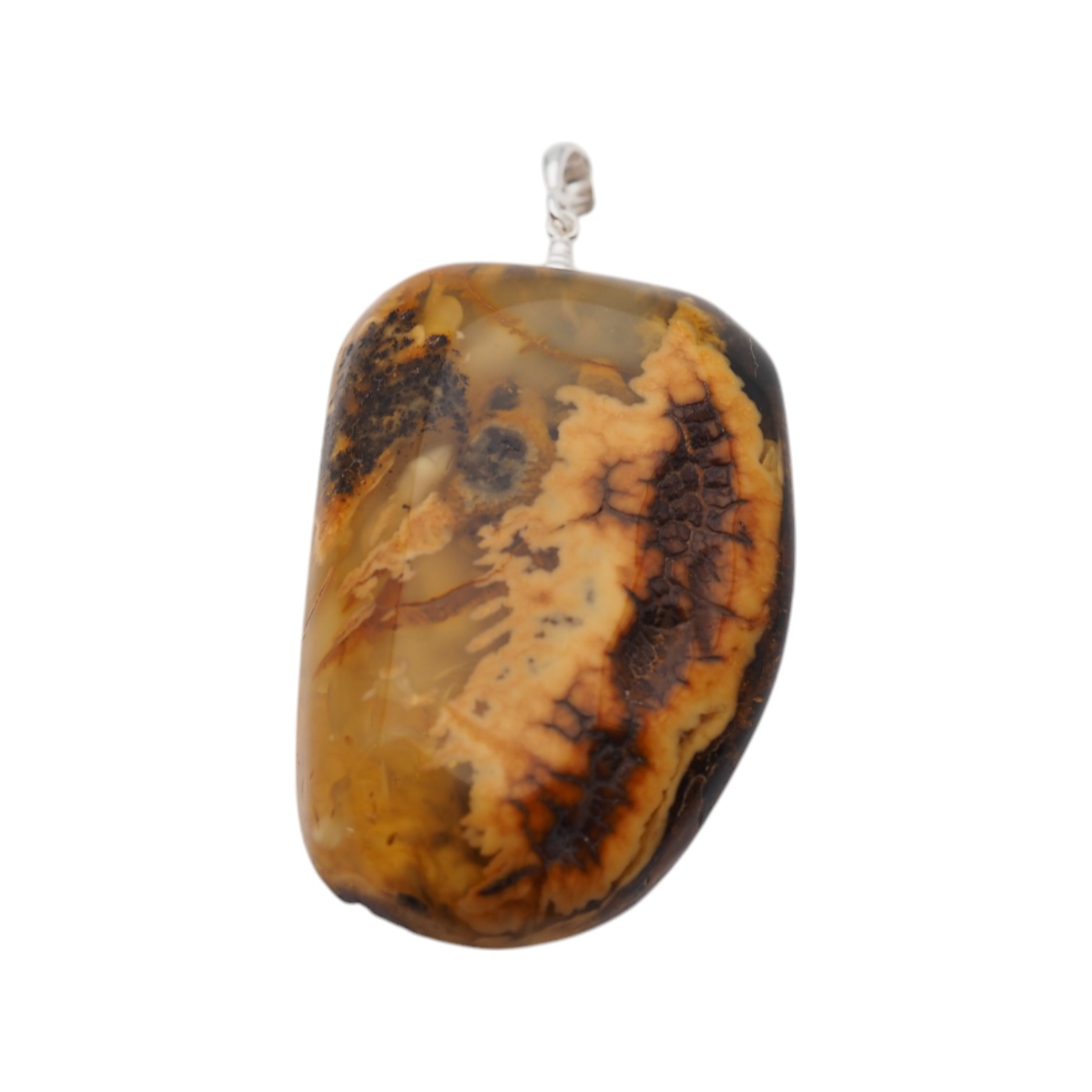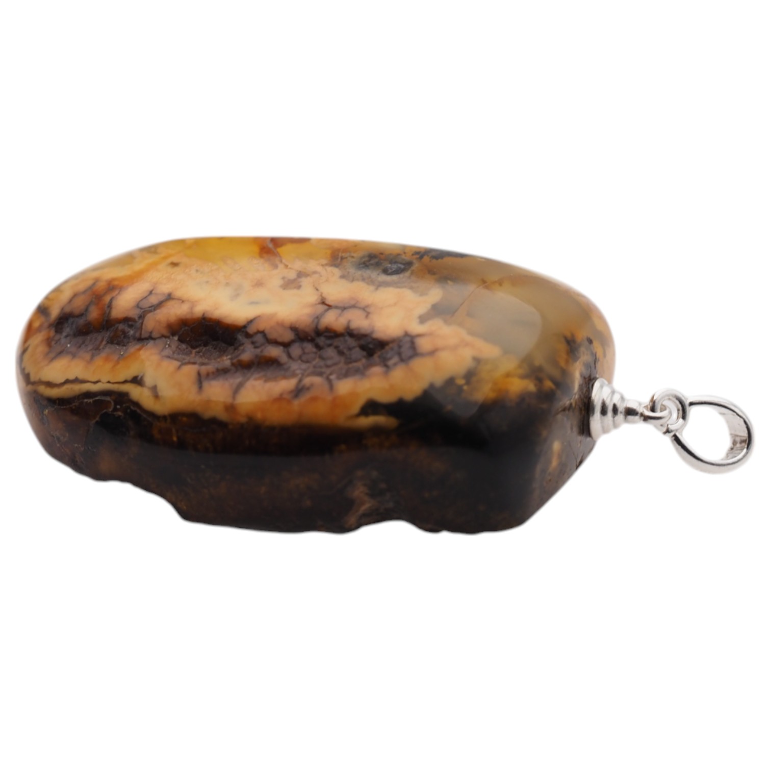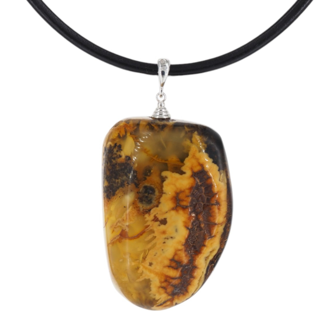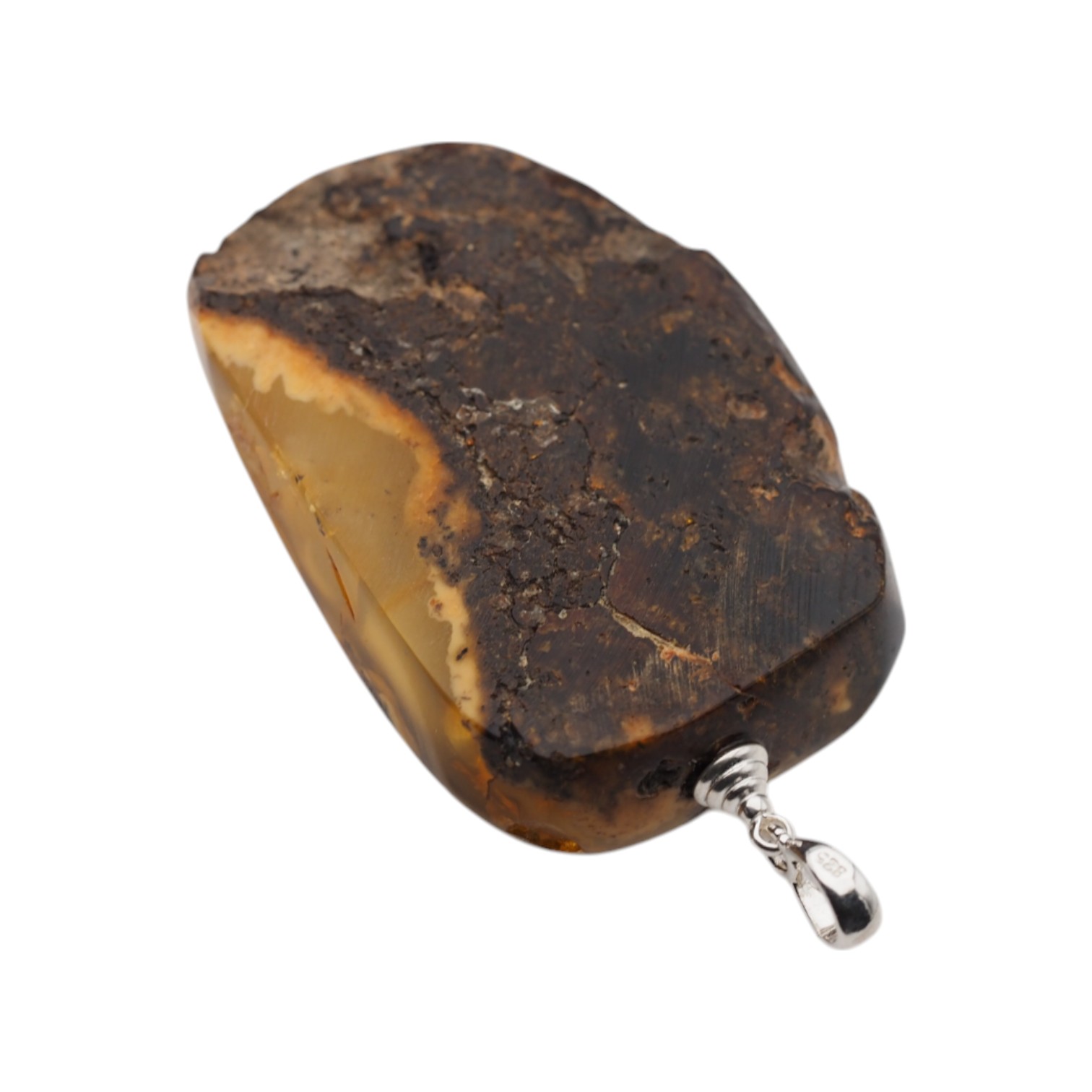 Ręcznie wykonana zawieszka z naturalnym bursztynem przyciąga uwagę ciepłą, miodowo-koniakową barwą i wyrazistą bryłą kamienia. Całość dopełnia oprawa ze srebra próby 925, która podkreśla naturalny charakter bursztynu i nadaje kompozycji eleganckie, jubilerskie wykończenie.