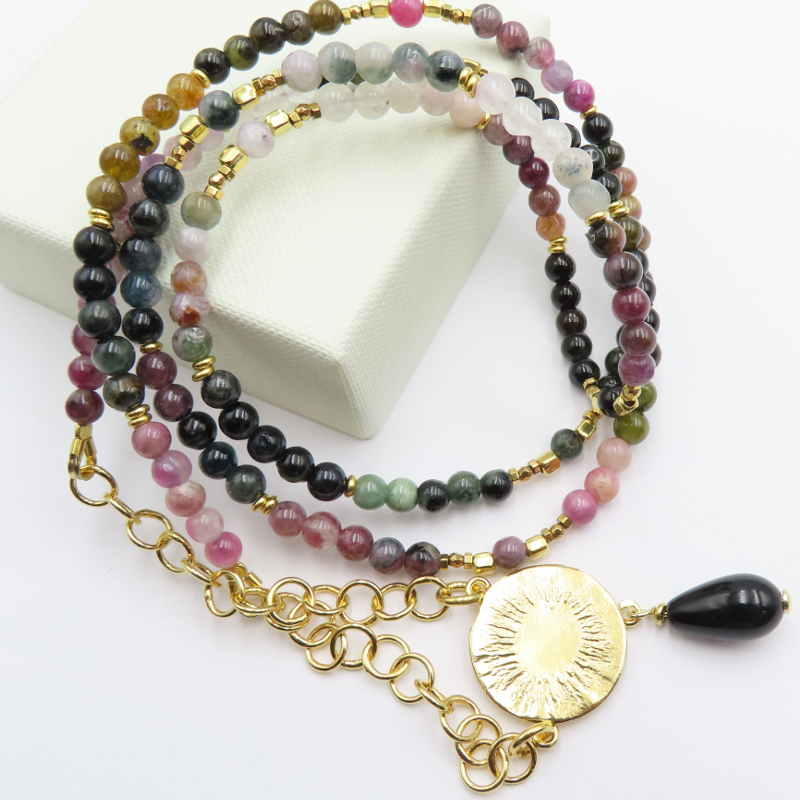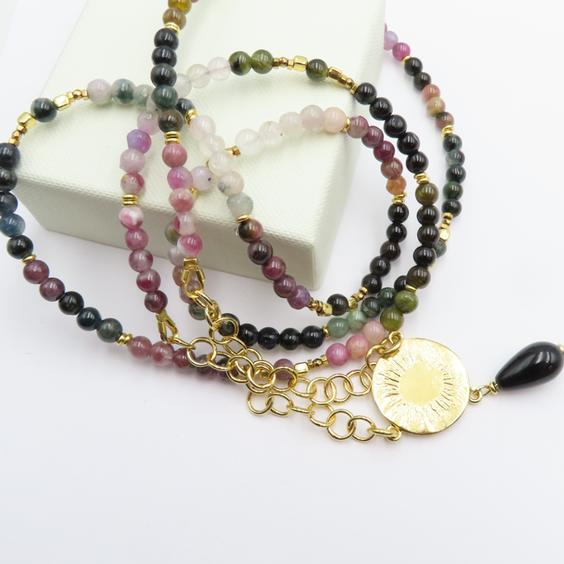 Naszyjnik Z kolorowym Turmalinem i hematytem w srebrze złoconym.