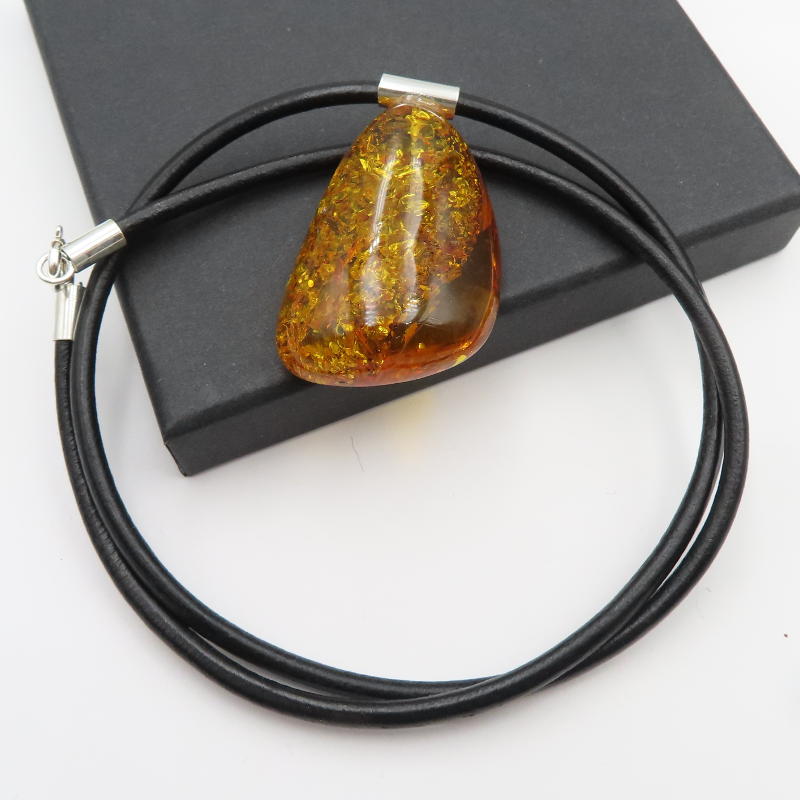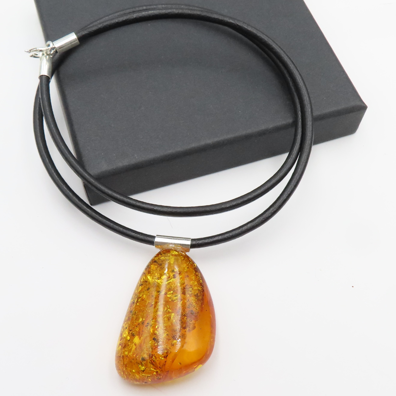 Naszyjnik na rzemieniu z ręcznie wykonaną zawieszką z koniakowego bursztynu o ciepłym, miodowo-brązowym odcieniu. W strukturze kamienia widoczne są charakterystyczne „łuski”, które nadają mu głębię i naturalny, organiczny rys. Bursztyn został opracowany przez artystę jubilera i wykończony srebrem próby 925, co podkreśla szlachetny charakter zawieszki.