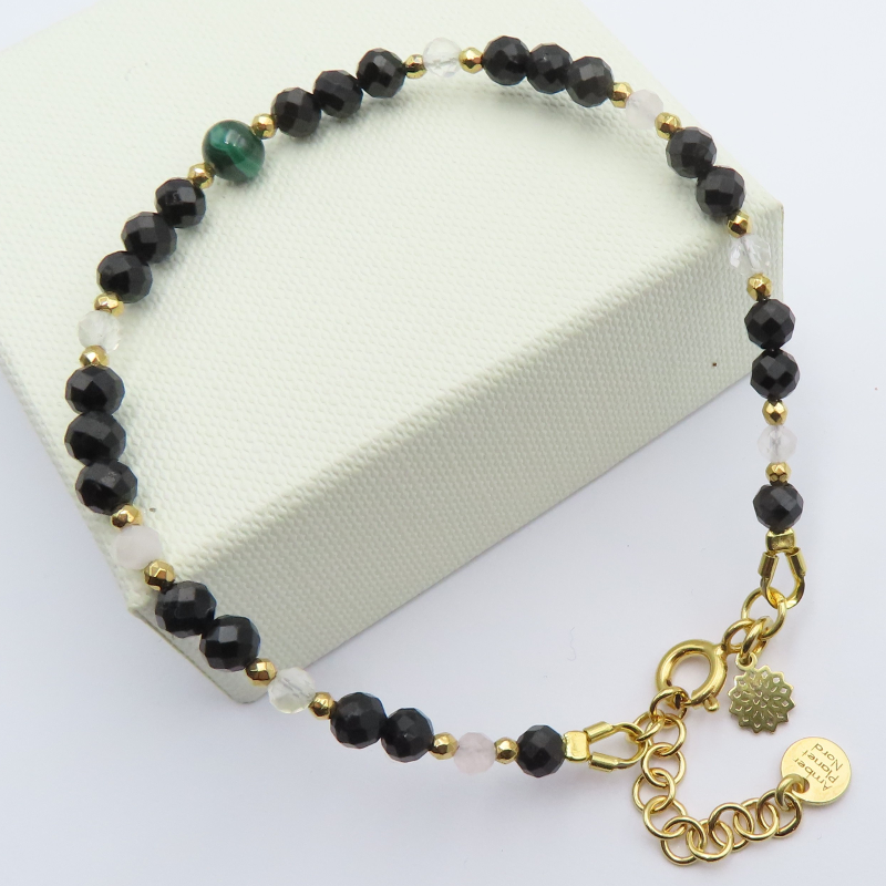 Ta bransoleta łączy w sobie wielobarwny mix kamieni naturalnych: głęboką zieleń malachitu, ciepły blask cytrynu, subtelny róż kwarcu różowego oraz kontrastujące akcenty hematytu i turmalinu. Fasetowane kulki pięknie łapią światło, a złocone srebro próby 925 dodaje całości eleganckiego, jubilerskiego wykończenia.