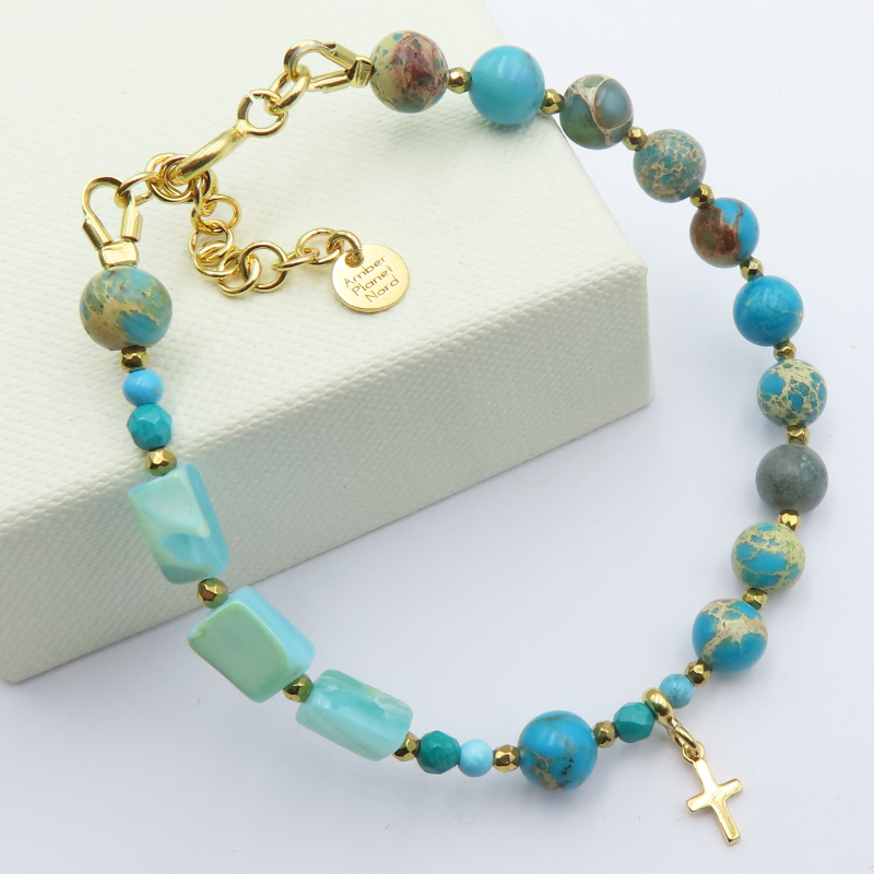 Bransoleta Różaniec - Amazonit, jaspis, turkus, hematyt i srebro złocone.