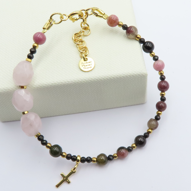Bransoleta Różaniec - Turmalin, kwarc różowy, hematyt i srebro złocone.