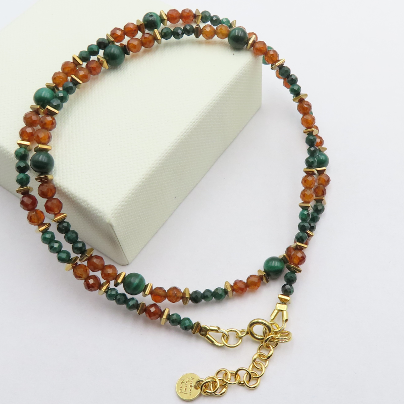 Ten ręcznie wykonany naszyjnik łączy w sobie malachit, brązowy granat i hematyt, tworząc elegancką, wielotonową kompozycję. Zieleń malachitu przyciąga wzrok naturalnym rysunkiem, a ciemniejsze akcenty granatu i metaliczny połysk hematytu nadają całości wyrazistości. Złocone srebro próby 925 podkreśla biżuteryjny charakter i dodaje ciepłego wykończenia.
