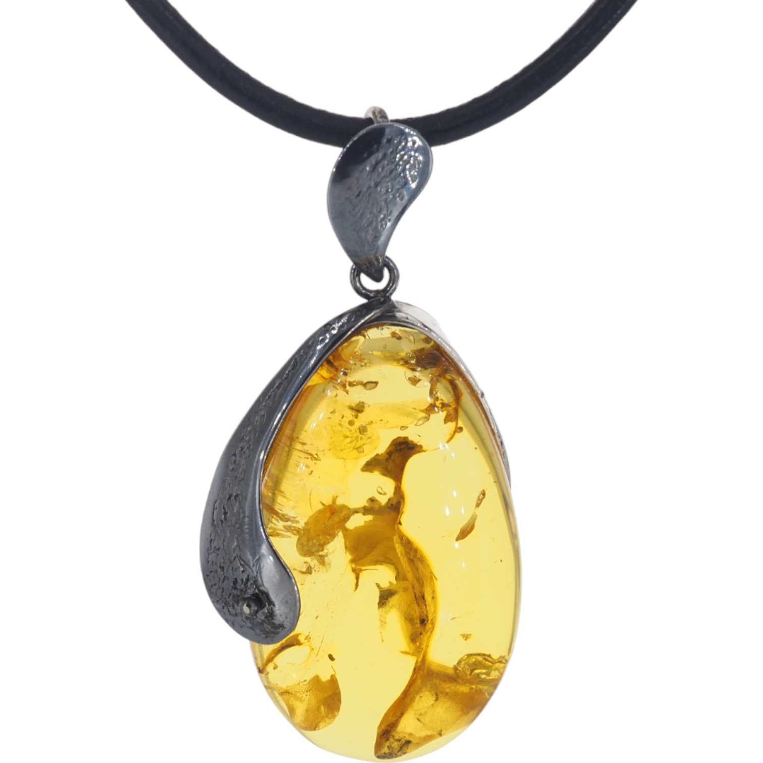 Bursztyn z inkluzją roślinną i młotkowane srebro oksydowane - naszyjnik na rzemieniu