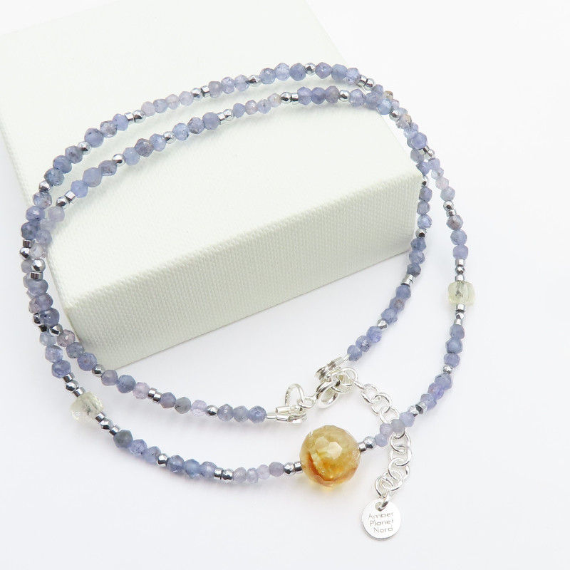 Naszyjnik z cytrynem, tanzanitem i hematytem w srebrze próby 925 to połączenie ciepłych, słonecznych tonów z chłodniejszym, głębokim akcentem oraz metalicznym połyskiem. Całość ma elegancki, a jednocześnie naturalny charakter – kamienie grają tu pierwszoplanową rolę, a srebro subtelnie podkreśla kompozycję.
