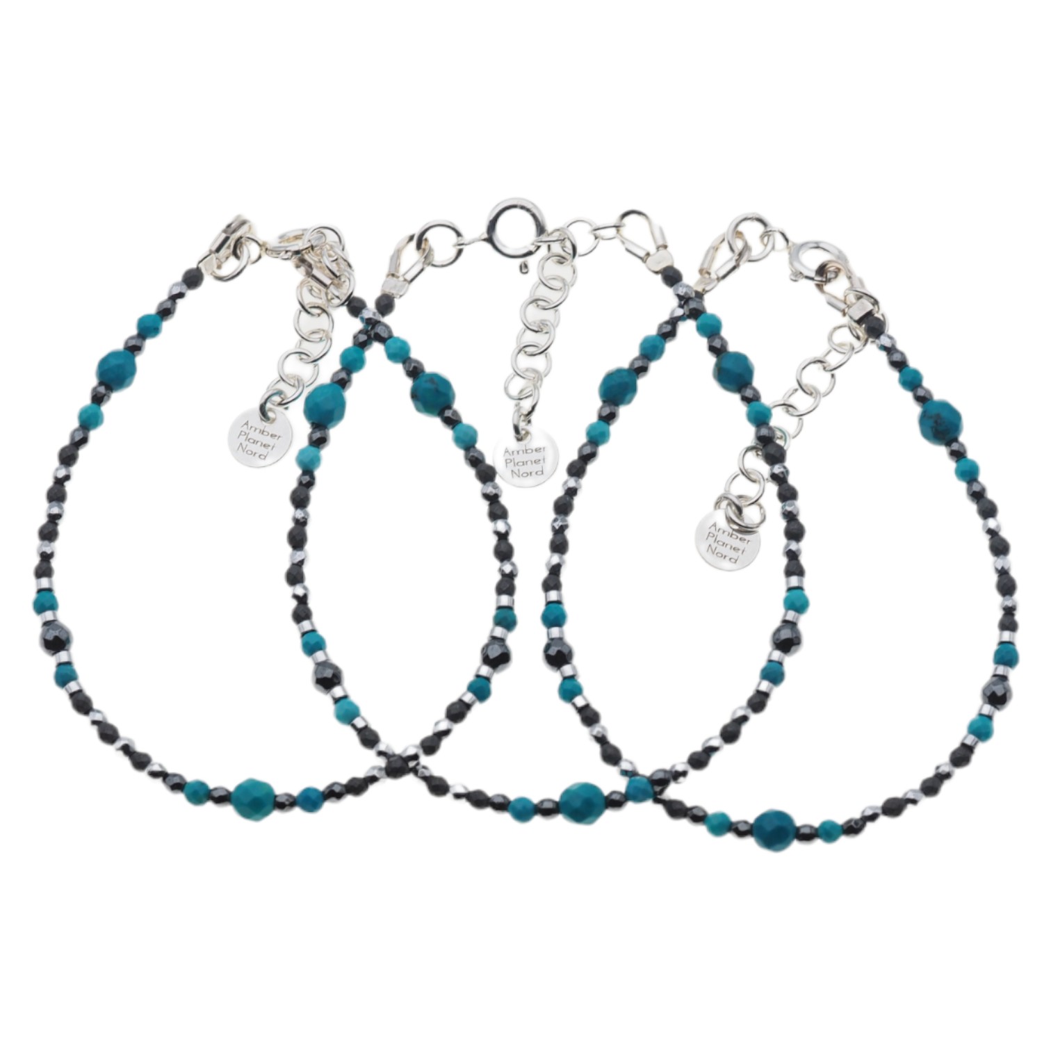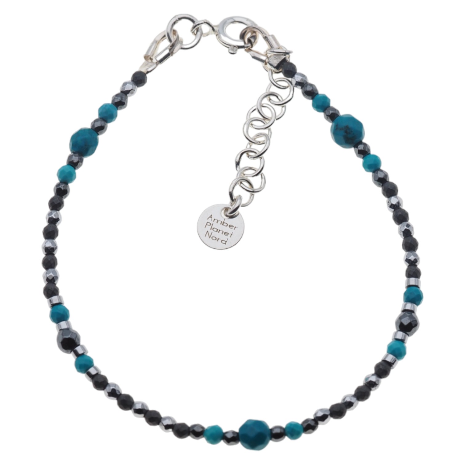 Bransoletka łączy chłodną, kamienną elegancję turkusu z metalicznym połyskiem hematytu, tworząc wyważoną kompozycję w odcieniach błękitu i grafitu. Całość uzupełnia srebro próby 925, które dodaje biżuterii szlachetnego, minimalistycznego charakteru.