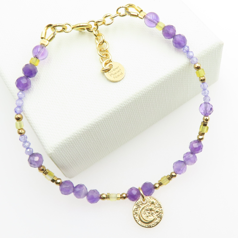 Bransoleta ametyst fasetowany, cyrkon, hematyt i agat w srebrze złoconym.