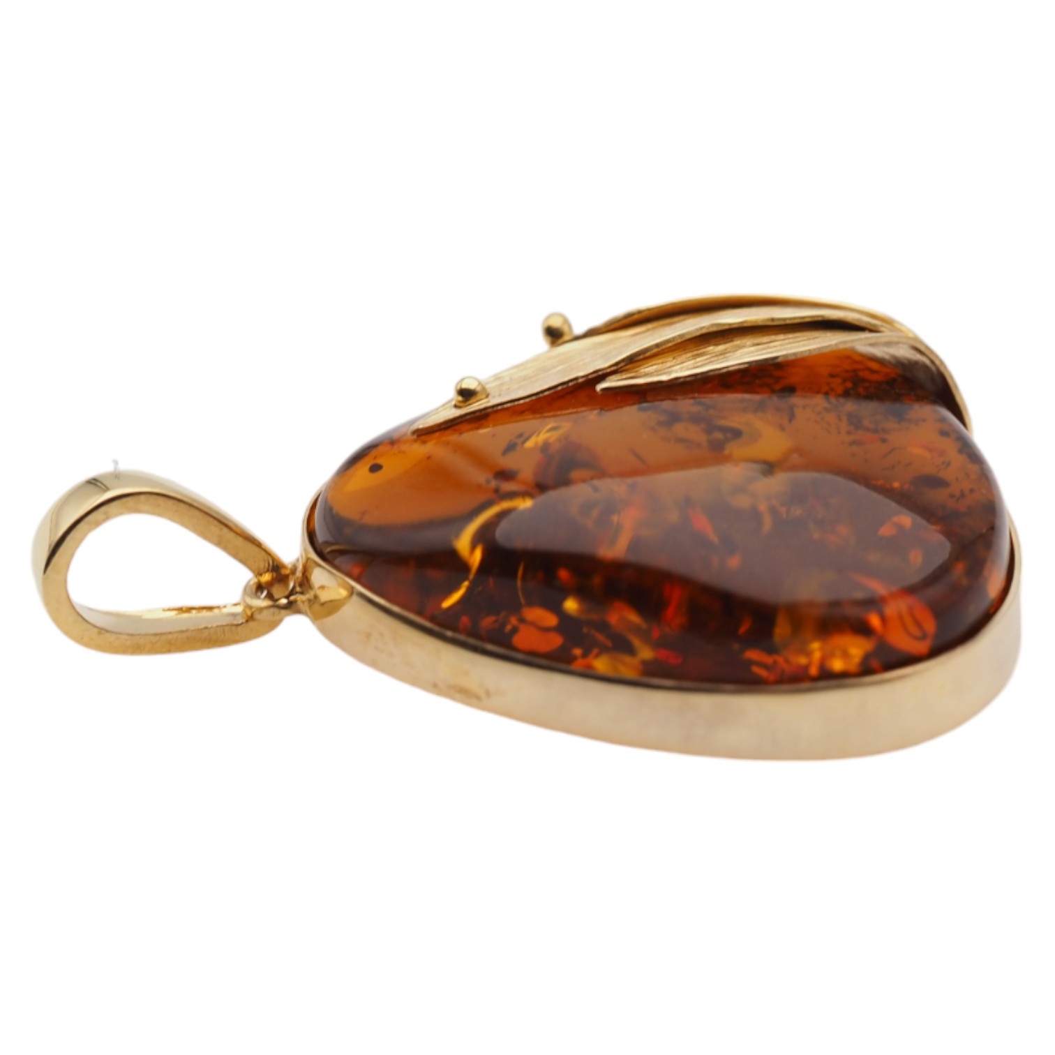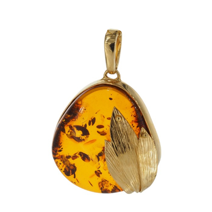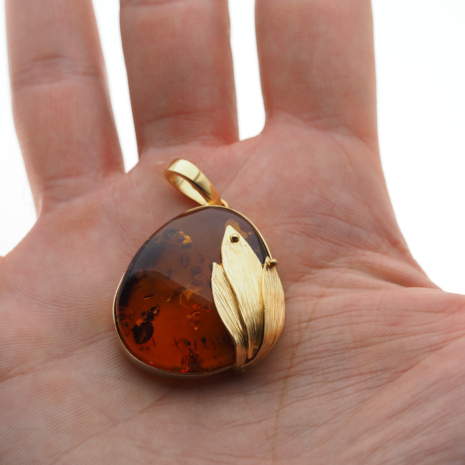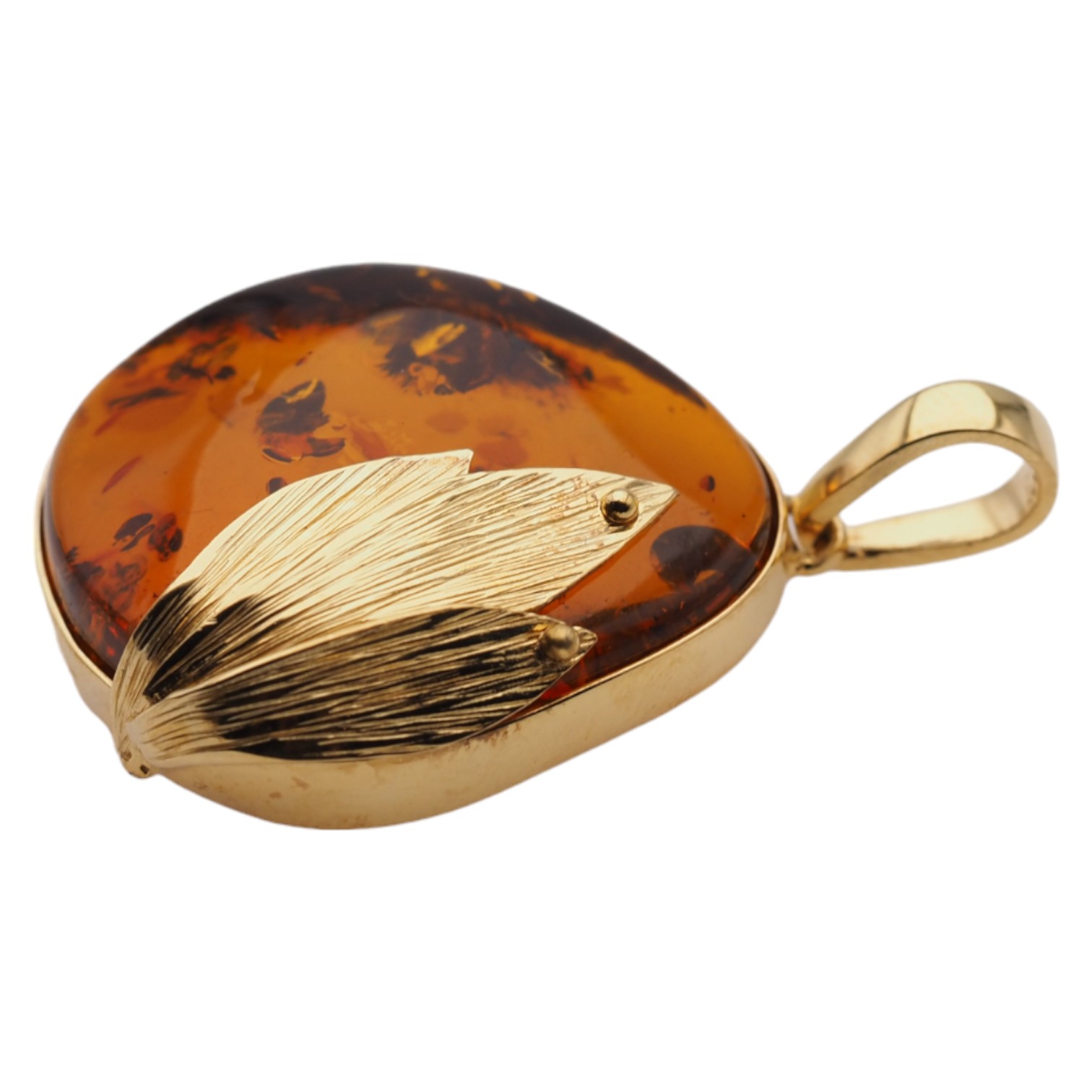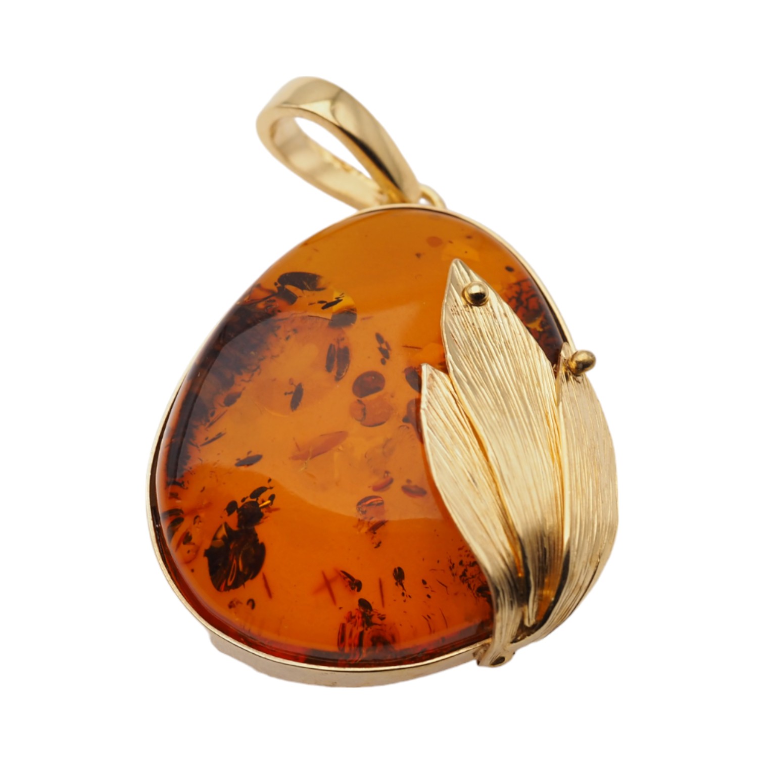 Ręcznie wykonana zawieszka z naturalnym bursztynem w odcieniu koniakowym, z wyraźnie zaznaczoną strukturą „łusek”. Kamień został artystycznie opracowany przez jubilera i oprawiony w srebro złocone próby 925, z dekoracyjnym motywem liścia, który podkreśla organiczny, szlachetny charakter całości.