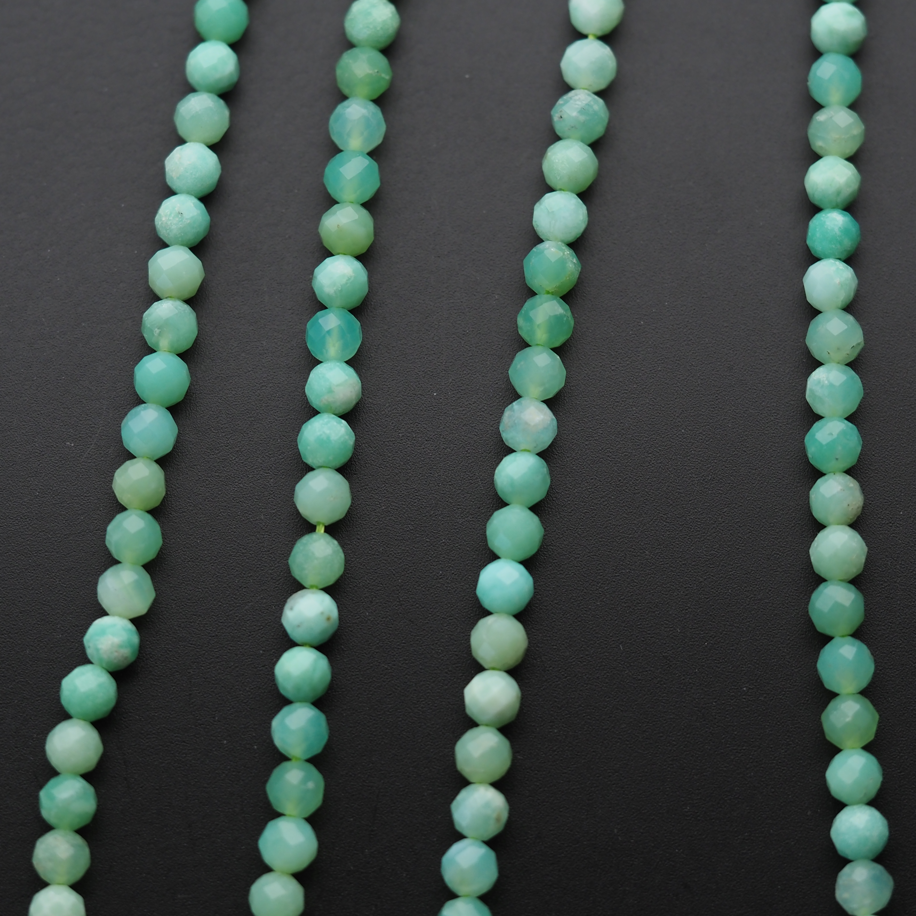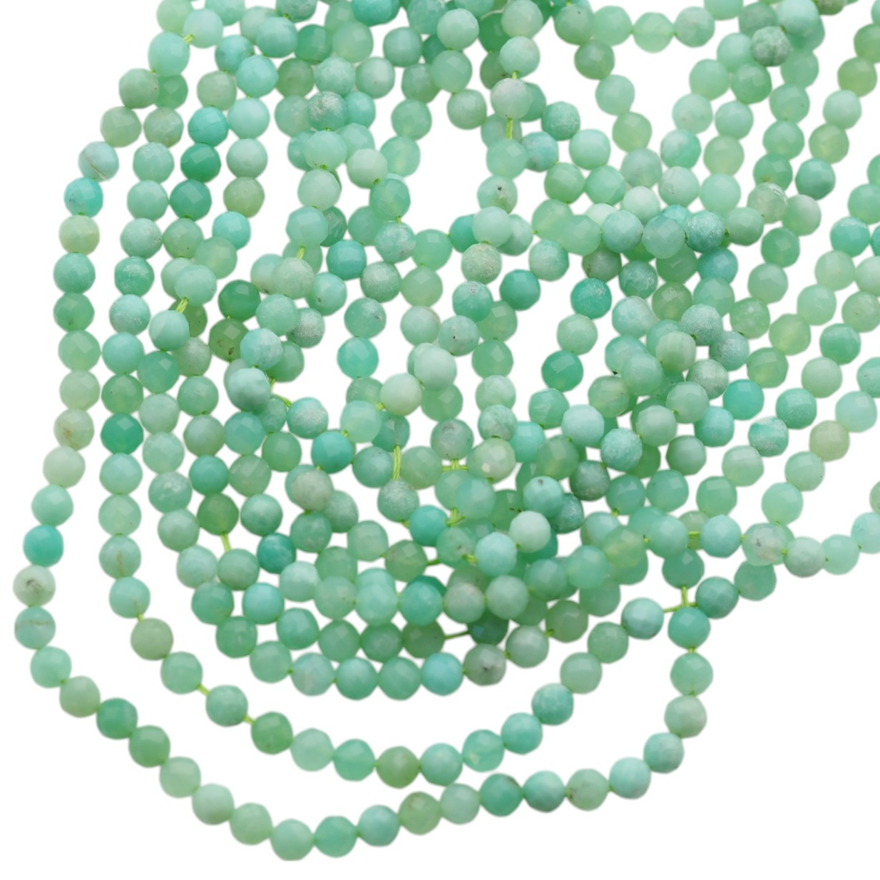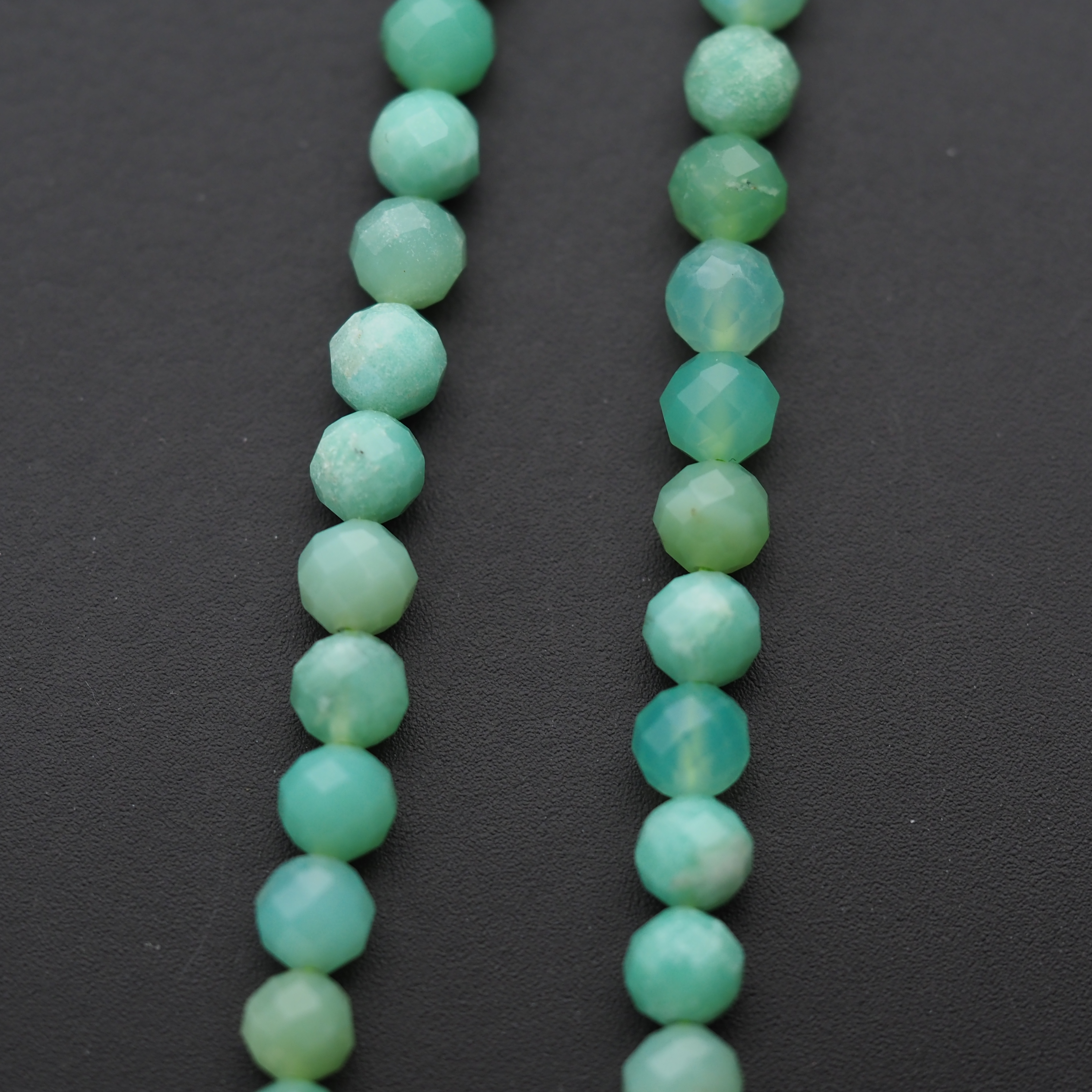 Naturalny chryzopraz fasetowany w formie kulek zachwyca świeżą, zieloną tonacją i subtelnym połyskiem, który podkreśla fasetowanie. Drobne, równo wyglądające kulki tworzą spójną, elegancką linię na sznurze.