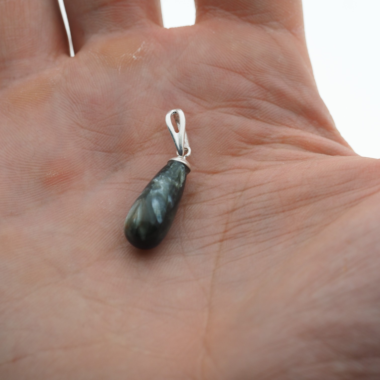Ręcznie wykonana zawieszka z naturalnym serafinitem w kształcie kropli przyciąga uwagę charakterystycznym, „pierzastym” rysunkiem kamienia. Zieleń serafinintu pięknie kontrastuje z chłodnym blaskiem srebrnej oprawy, nadając całości spokojny, elegancki charakter.