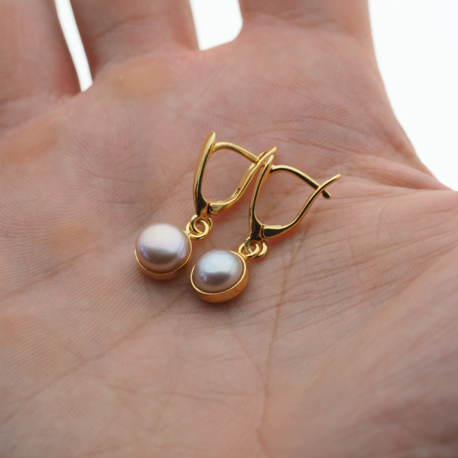 Kolczyki na biglach angielskich z różowymi Perłami hodowanymi i srebrem złoconym.
