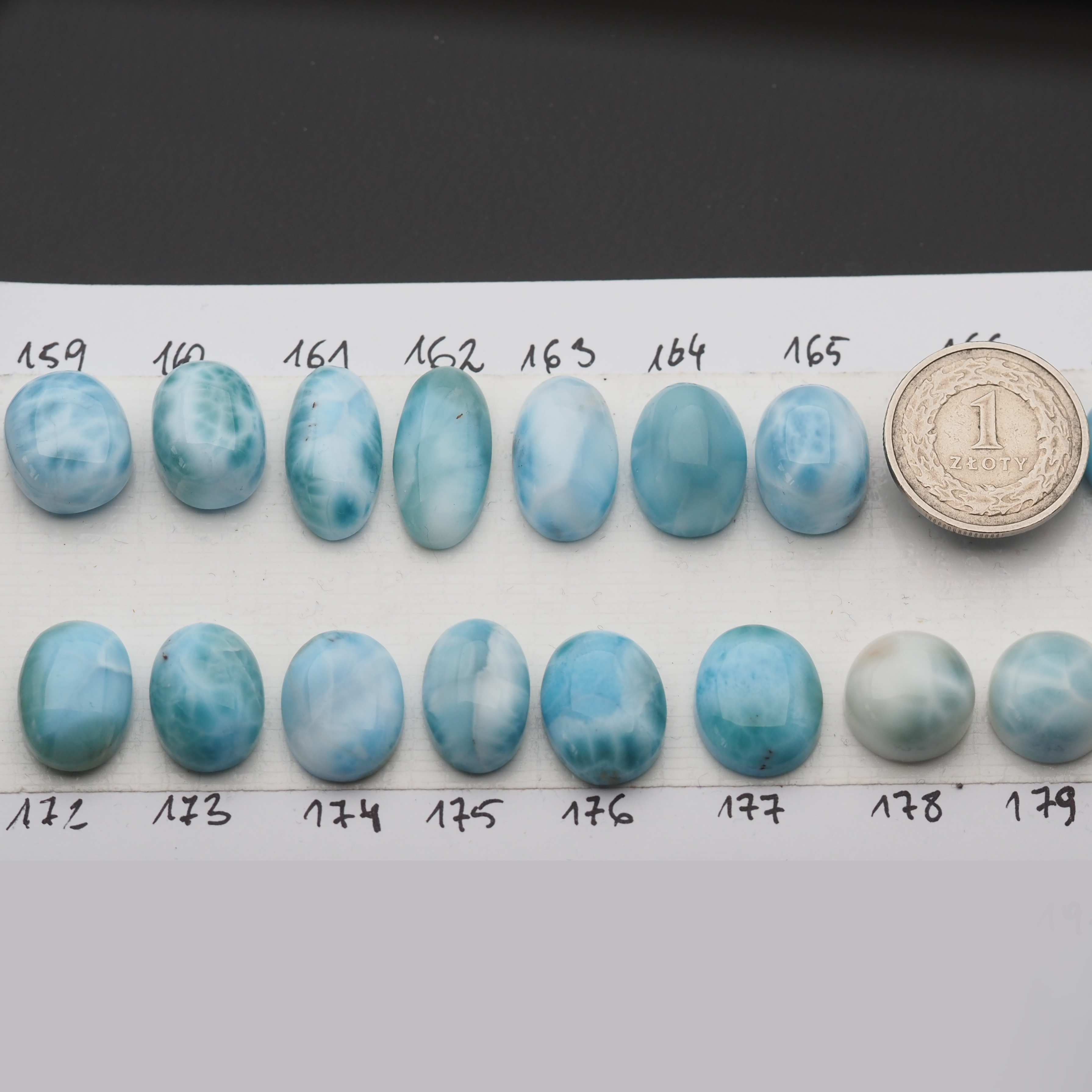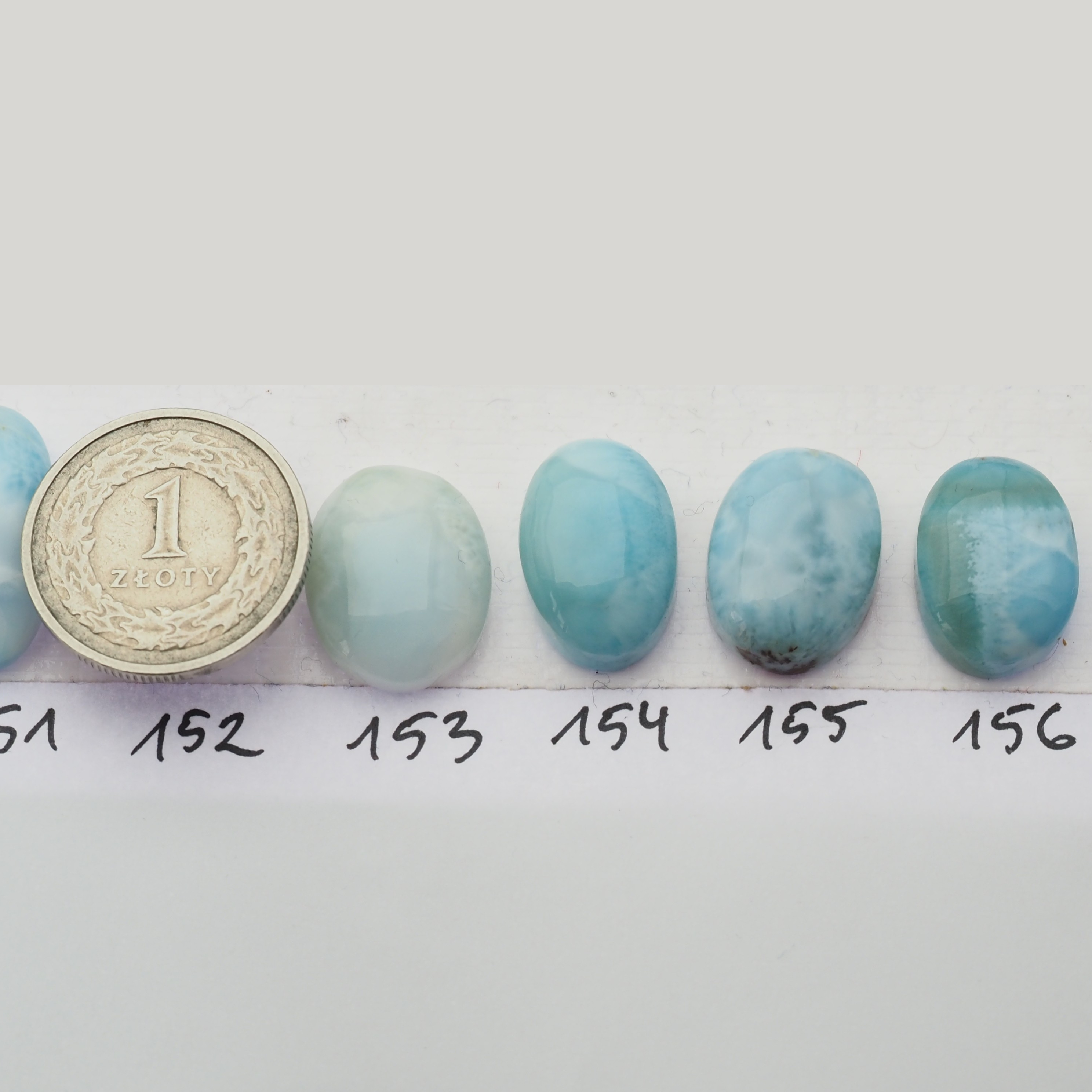 Naturalny larimar w formie owalnego kaboszonu. To błękitny kamień półszlachetny o spokojnym, „morskim” charakterze wizualnym, ceniony również ze względu na rzadkie występowanie.