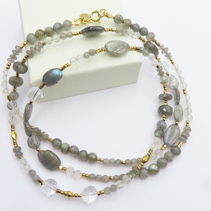 Naszyjnik mix kamieni. Labradoryt, kryształ górski i złoty hematyt.
