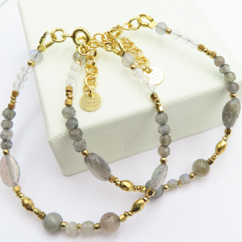 Bransoletka mix kamieni. Labradoryt, kryształ górski i złoty hematyt.
