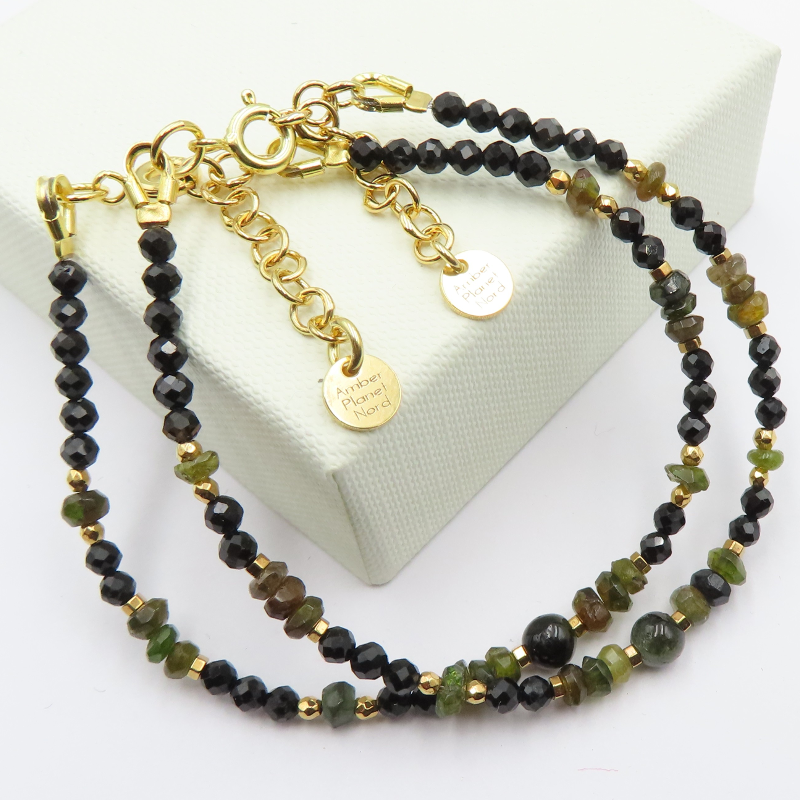 Bransoletka z czarnego i zielonego turmalinu uzupełniona złotym hematytem tworzy eleganckie, a jednocześnie naturalne zestawienie kolorów. Kontrast głębokiej czerni z odcieniami zieleni przyciąga wzrok, a złote akcenty dodają całości subtelnego blasku.