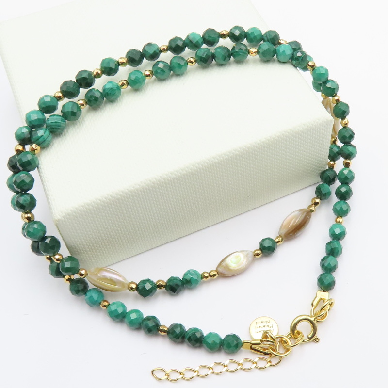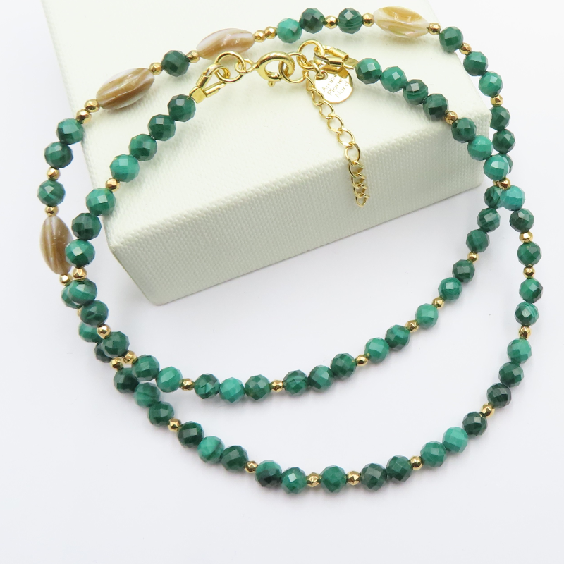 Naszyjnik łączy fasetowany malachit o głębokiej, zielonej barwie z naturalnym akcentem muszli. Całość uzupełniają złote hematyty oraz detale ze srebra złoconego próby 925, co daje efekt eleganckiej, biżuteryjnej kompozycji z wyraźnym, dekoracyjnym charakterem.