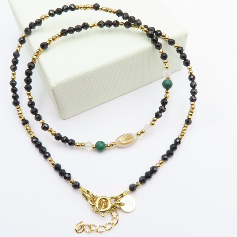 Naszyjnik malachit, czarny turmalin i muszla w srebrze złoconym.