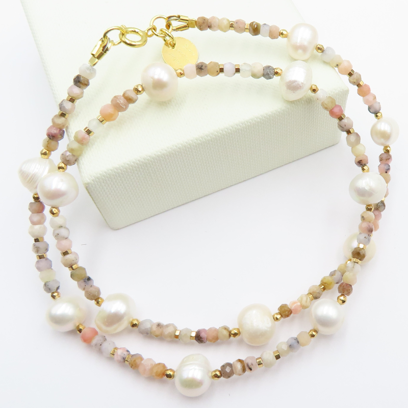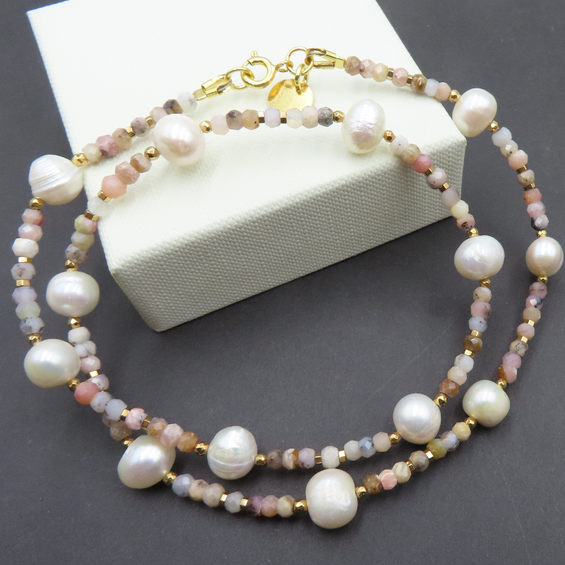 Naszyjnik z Perłami Naturalnymi, Opalem Różowym i Hematytem w srebrze.