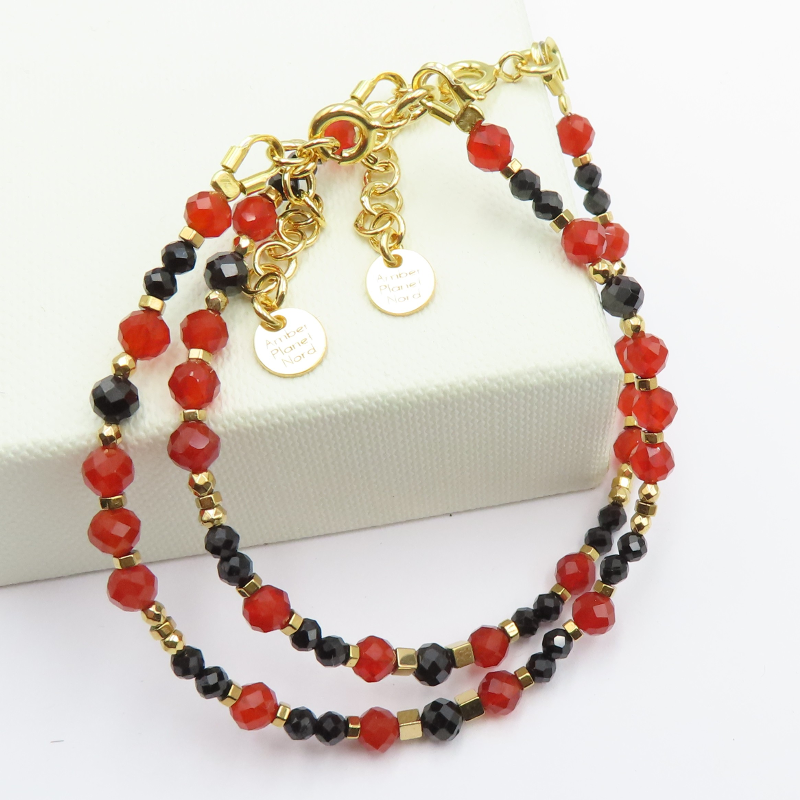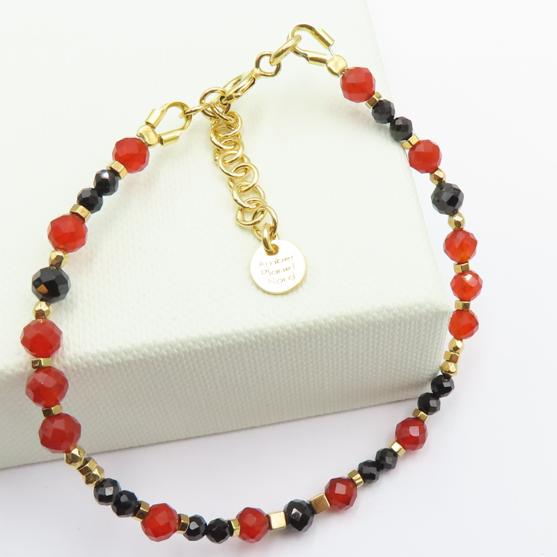 Bransoletka z miksem kamieni naturalnych łączy głębokie, eleganckie barwy turmalinu, spinelu i czerwonego onyksu z połyskiem złotego hematytu. Całość ma nowoczesny, biżuteryjny charakter: drobne kamienie tworzą subtelny rytm kolorów, a złocone akcenty dodają wrażenia lekkości i wyrafinowania.