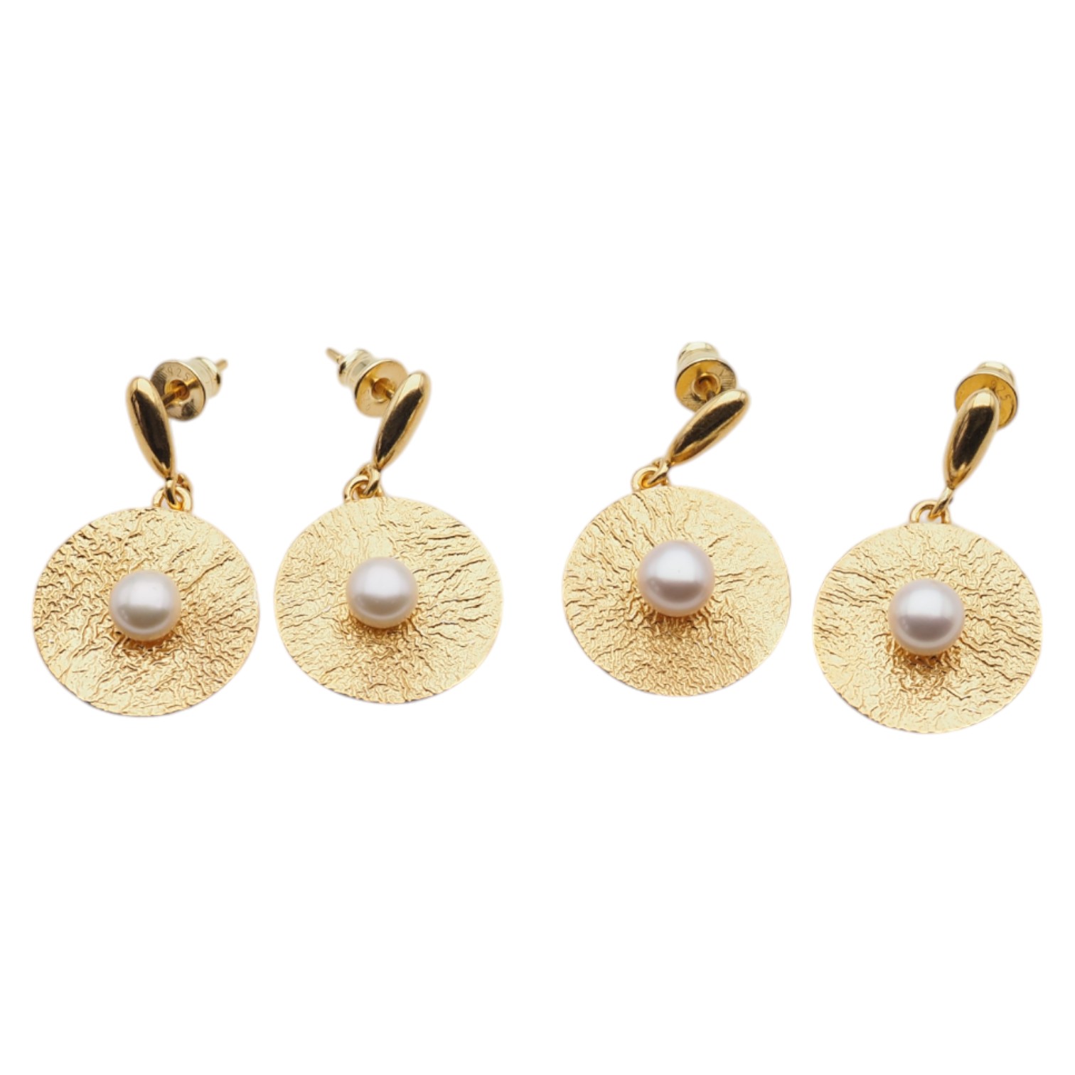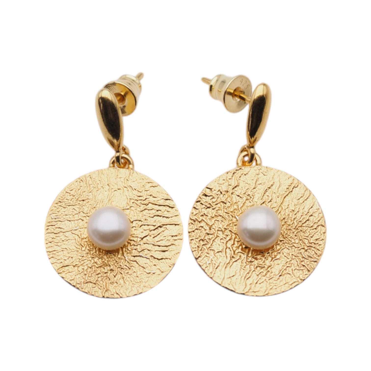 Kolczyki na wiszących sztyftach z białymi Perłami hodowanymi i złoconym srebrem młotkowanym.