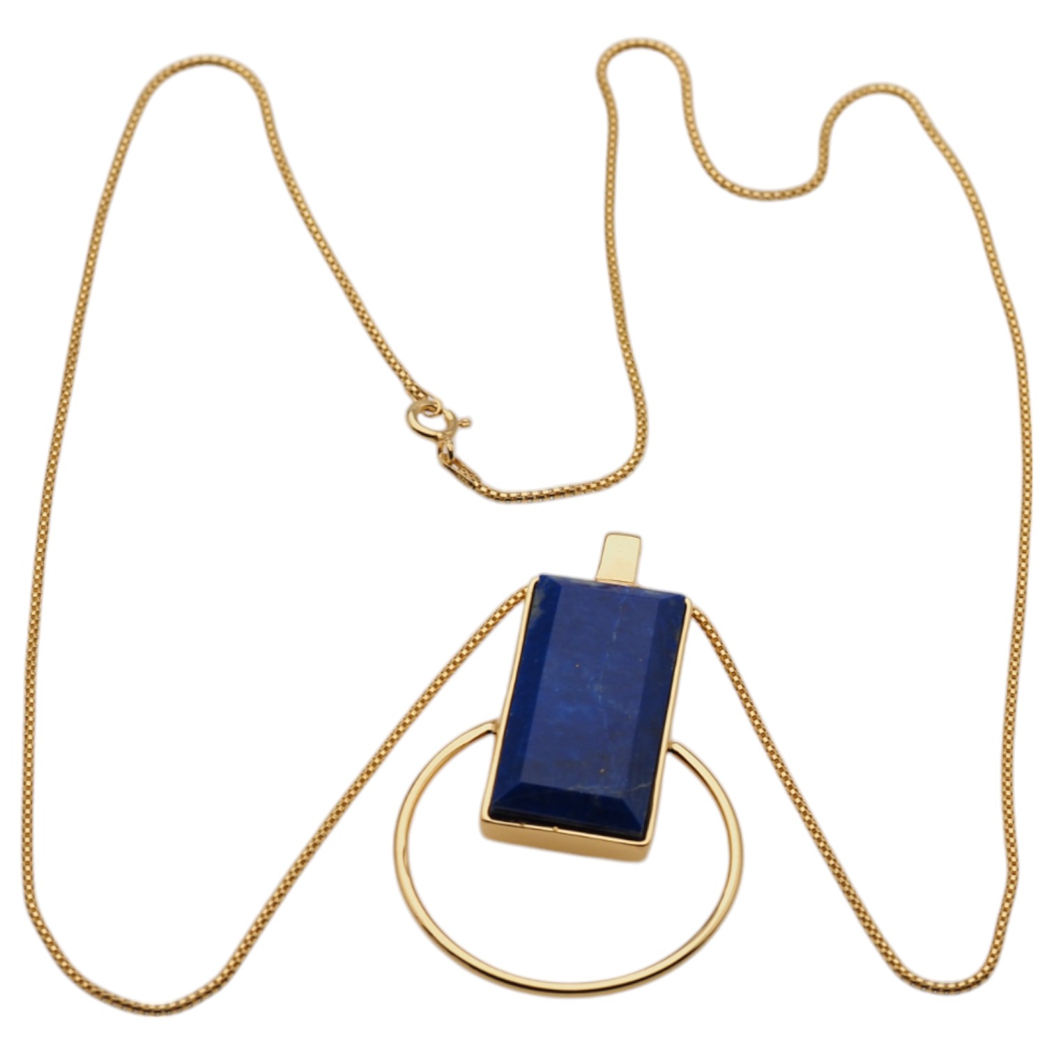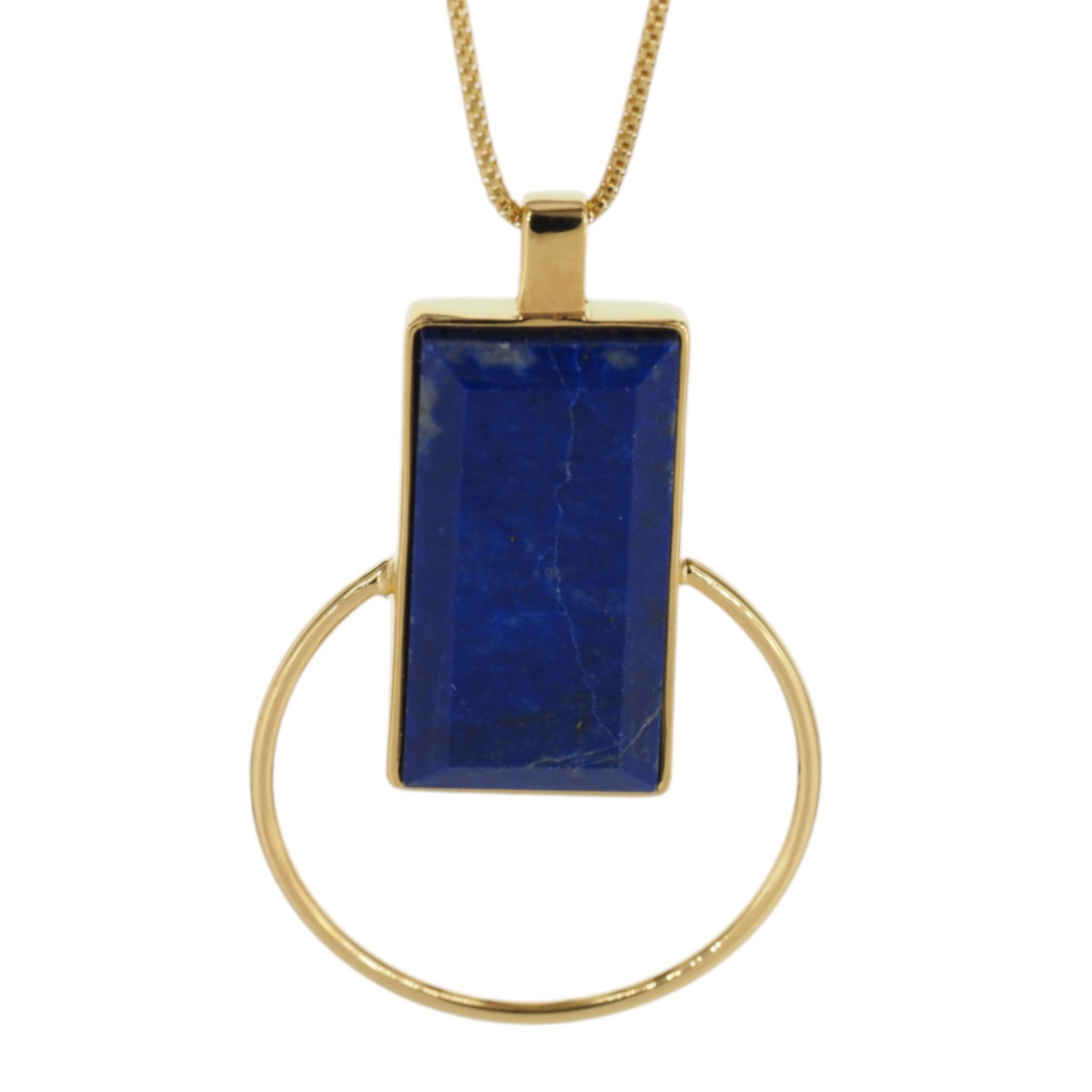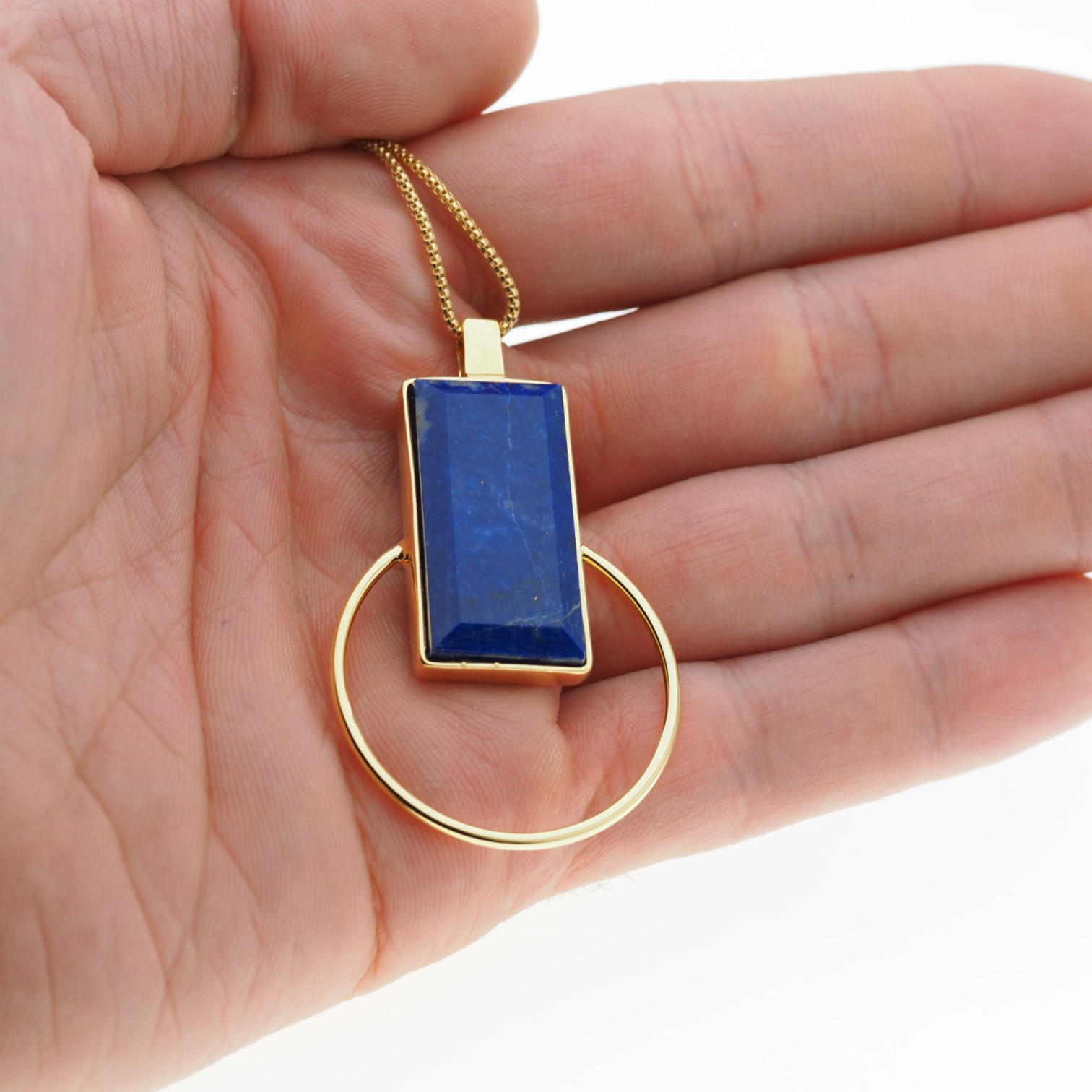 Naszyjnik z lapis lazuli przyciąga wzrok głębokim, nasyconym odcieniem niebieskiego i elegancką, geometryczną formą. Naturalny kamień półszlachetny ma kształt prostokąta i został osadzony w srebrnej oprawie o szlachetnym, złoconym wykończeniu.