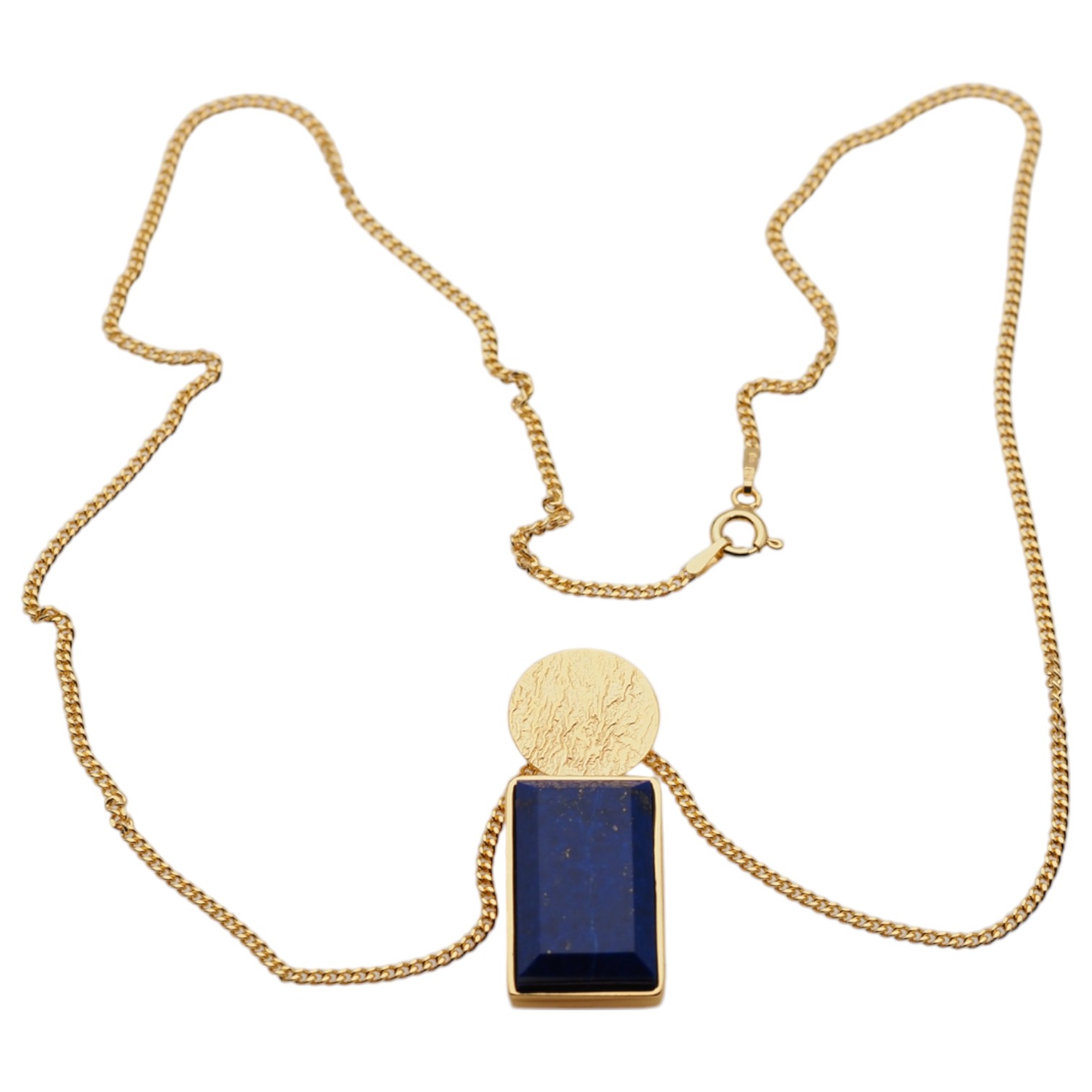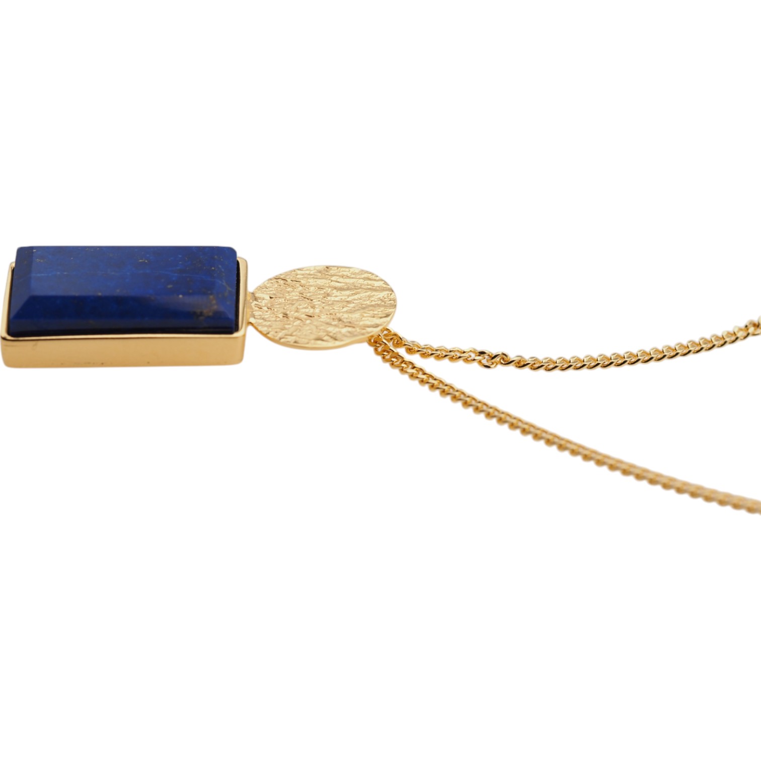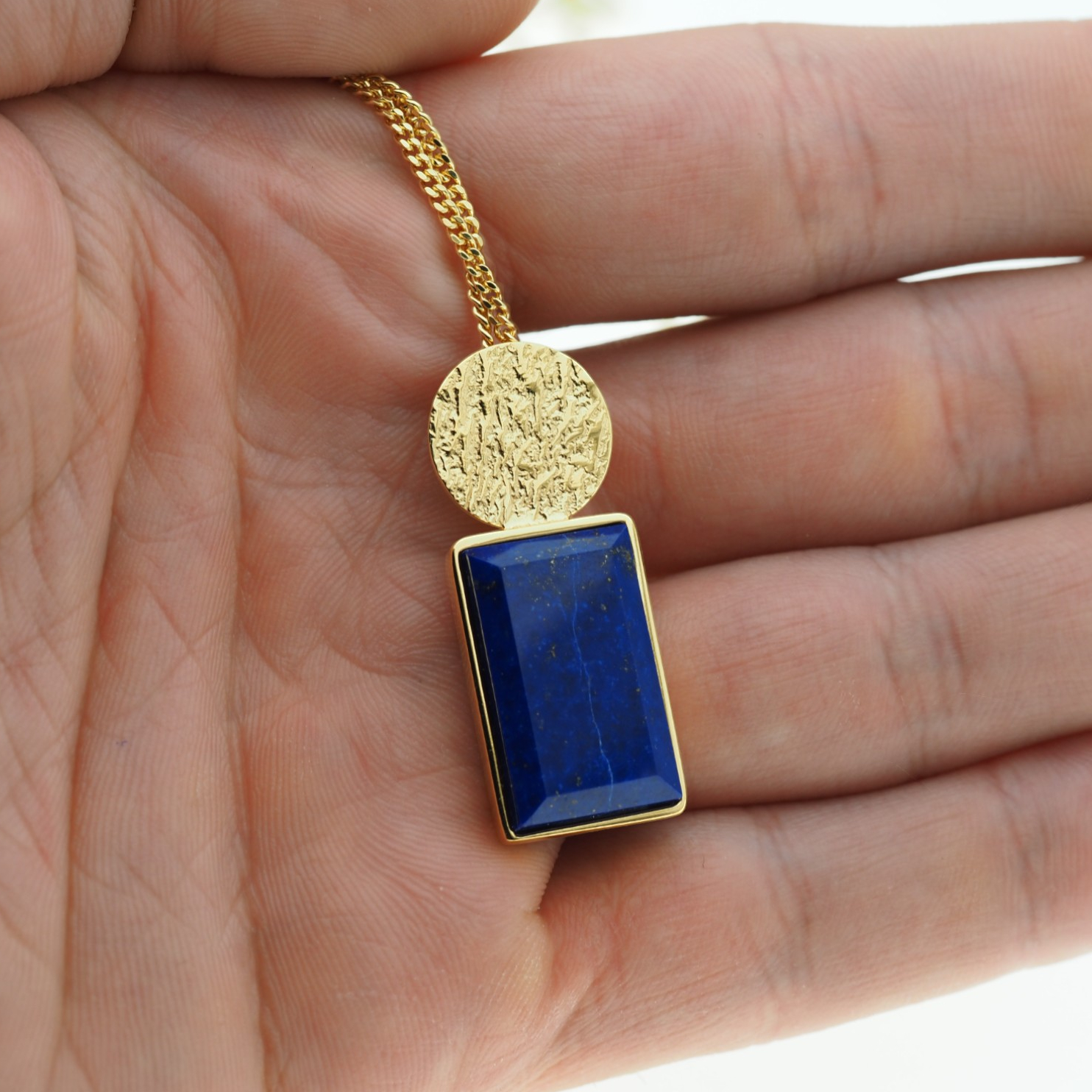 Naszyjnik z Lapis Lazuli to elegancka, ręcznie wykonana biżuteria z naturalnym kamieniem półszlachetnym w kształcie prostokąta. Głęboki, intensywny odcień niebieskiego przyciąga wzrok i tworzy szlachetne, wyraziste tło dla srebrnej oprawy. Całość dopełnia ręcznie młotkowana blaszka, która dodaje kompozycji charakteru i delikatnie rzemieślnicznego wykończenia.
