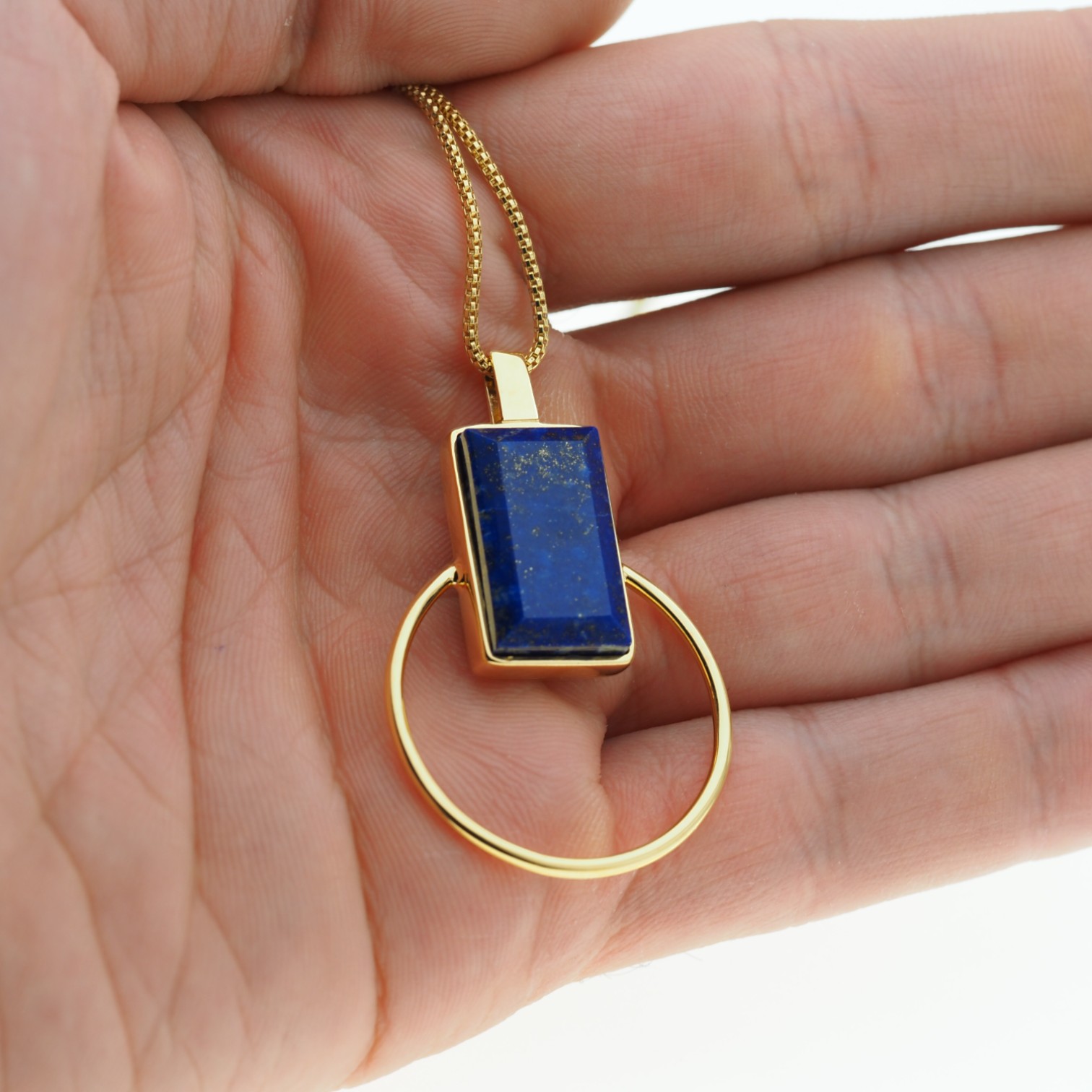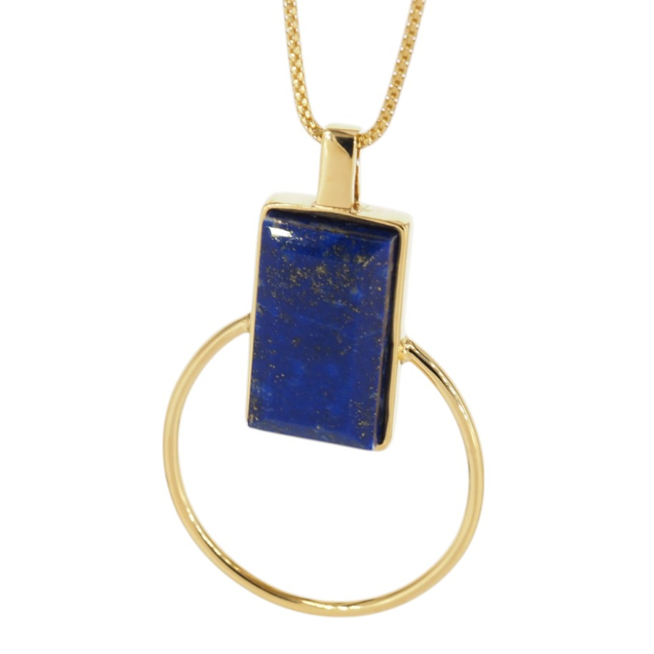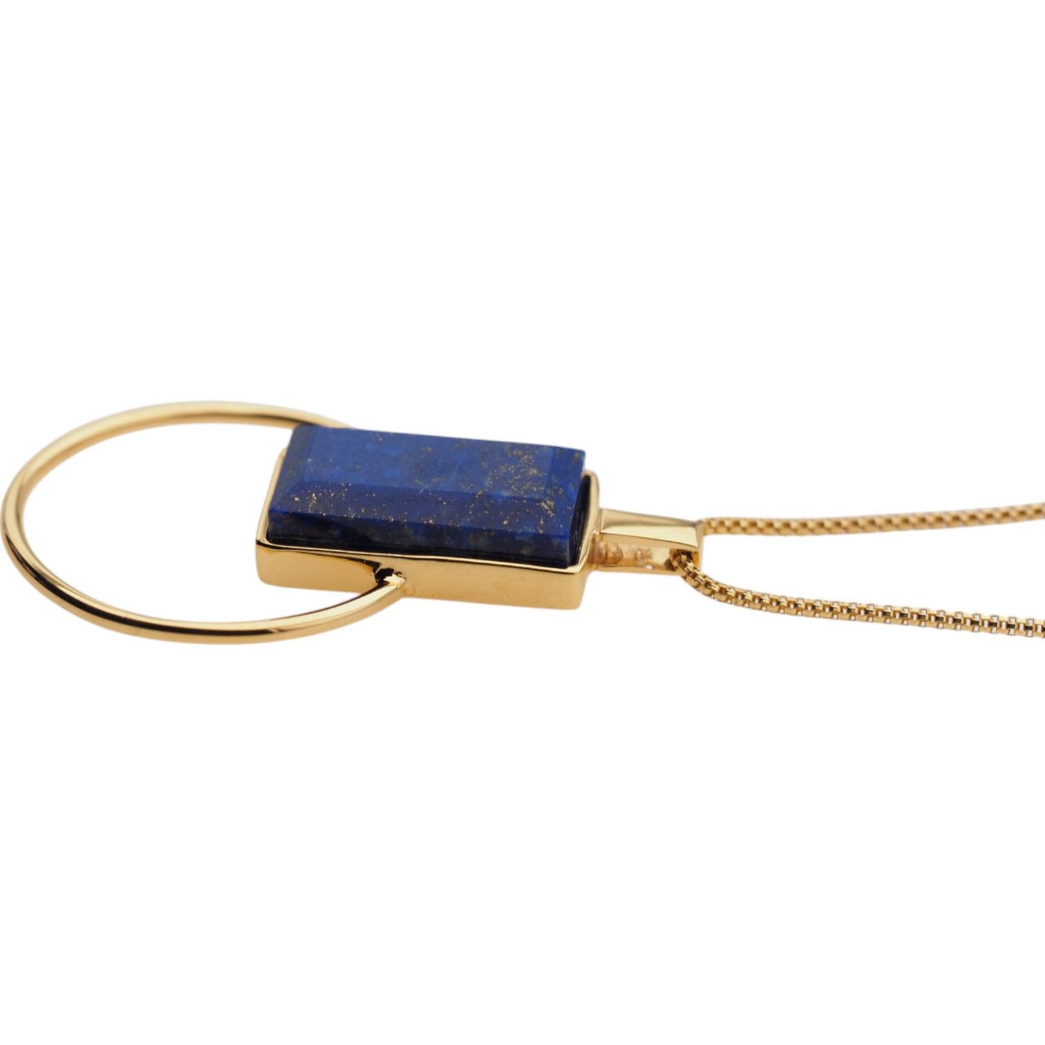 Naszyjnik z lapis lazuli przyciąga wzrok głębokim, nasyconym odcieniem niebieskiego kamienia w kształcie prostokąta. Ręcznie wykonana, srebrna oprawa ze srebra złoconego próby 925 dodaje całości elegancji i podkreśla szlachetny charakter naturalnego kamienia.