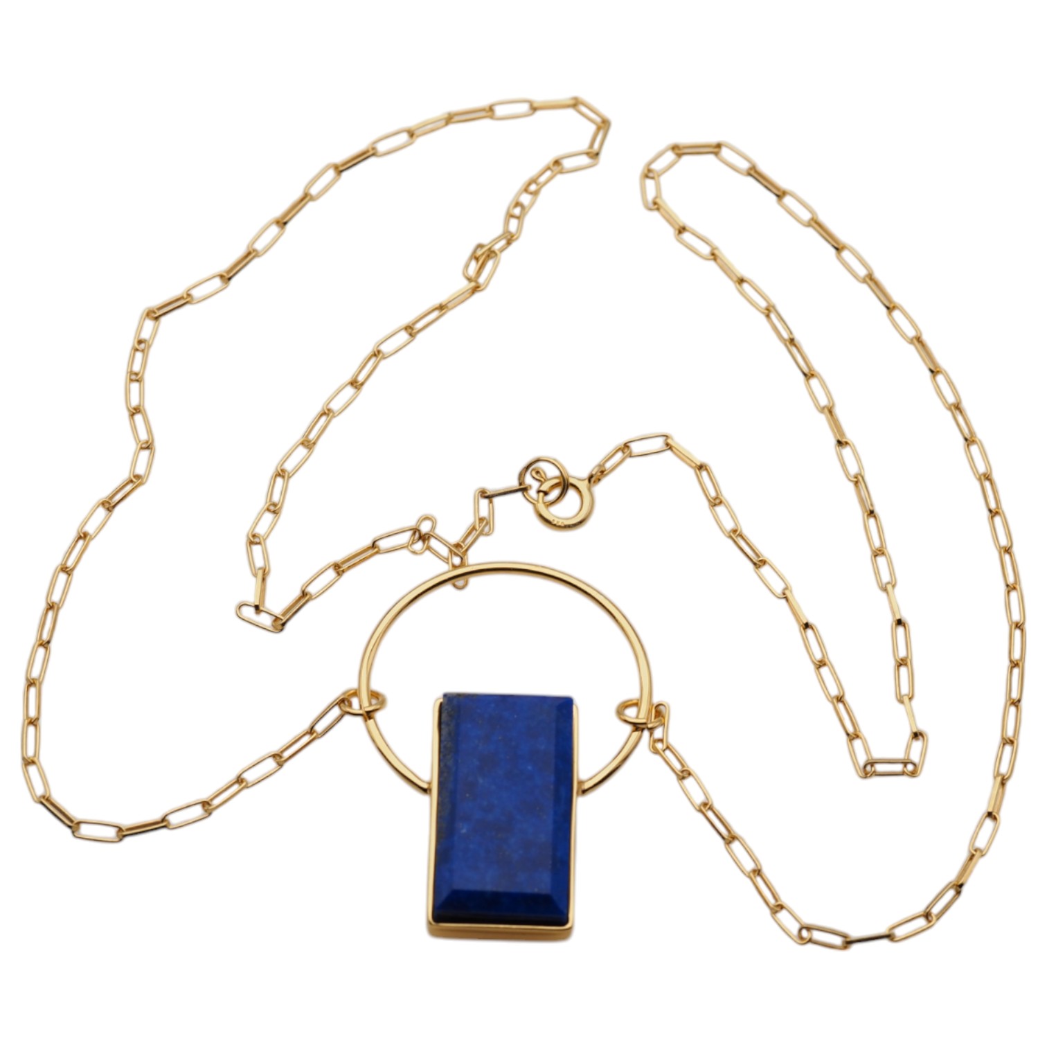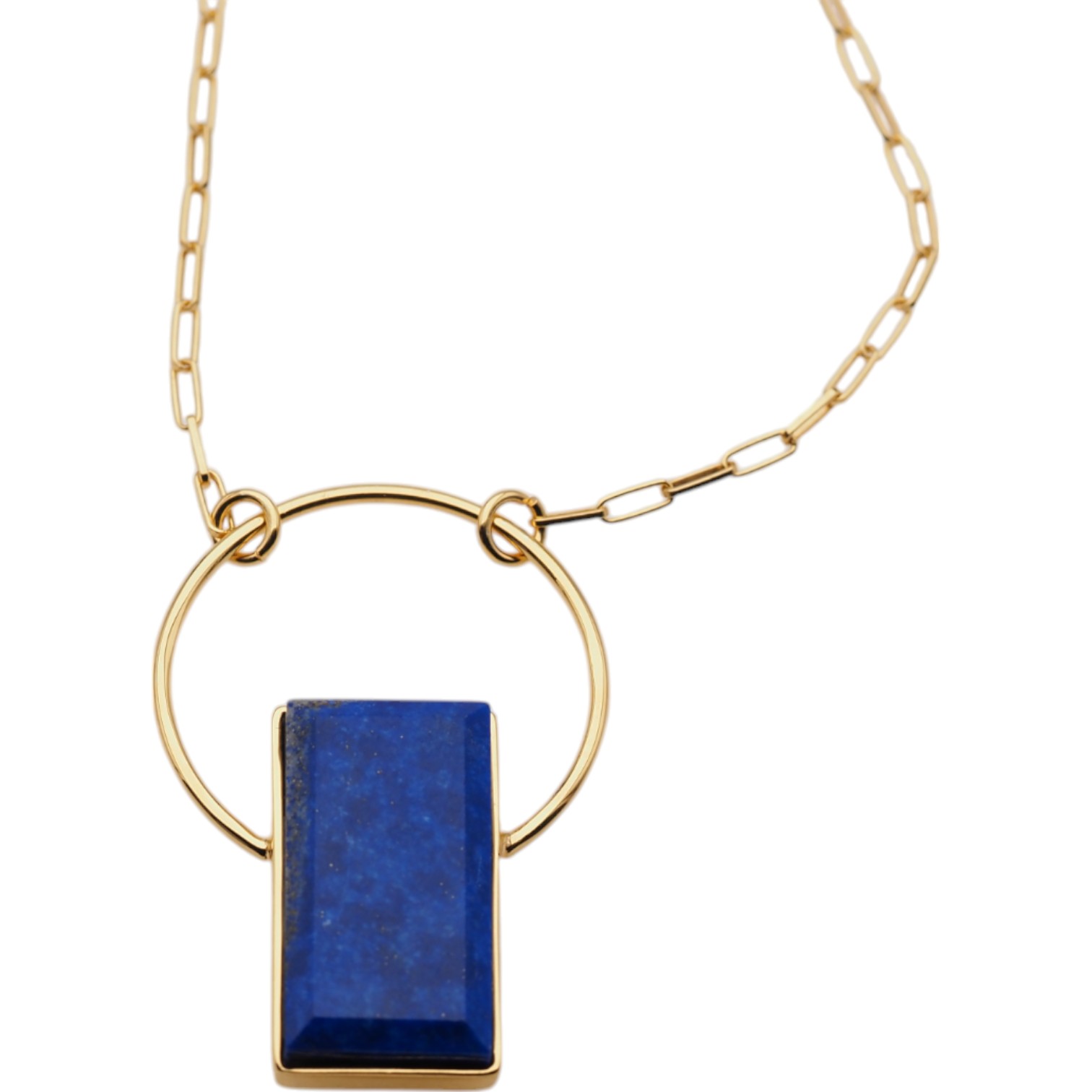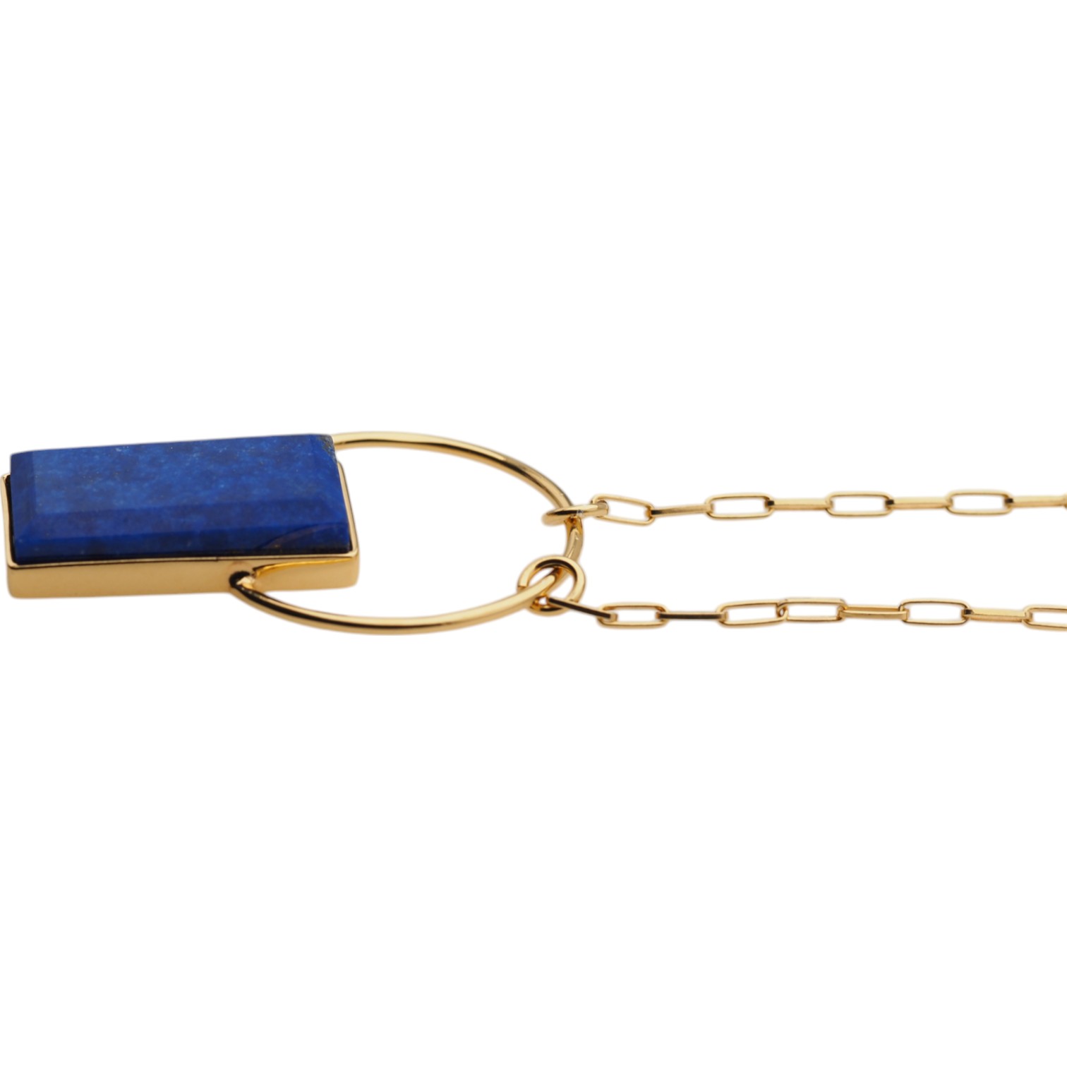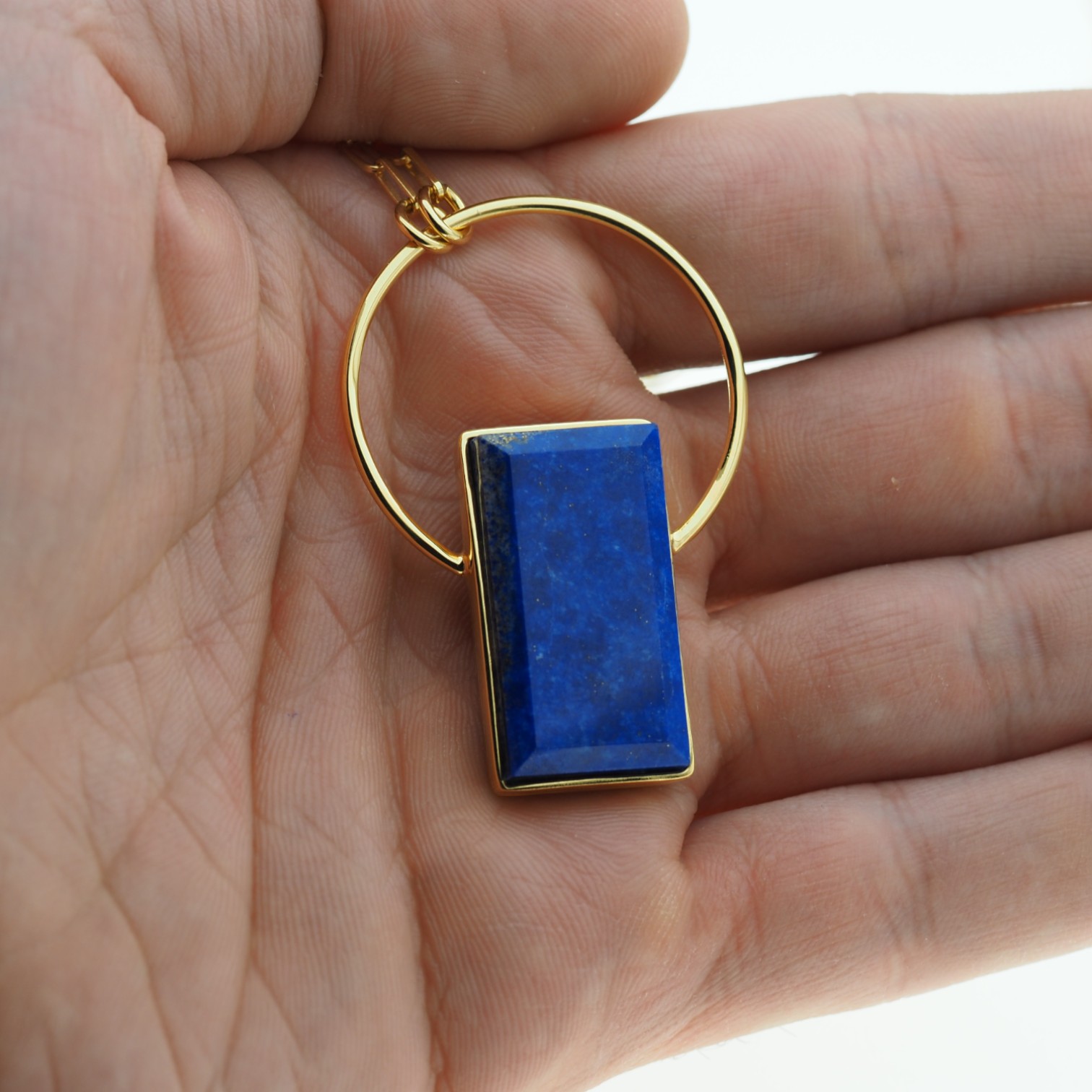 Naszyjnik z lapis lazuli przyciąga wzrok głębokim, nasyconym odcieniem niebieskiego kamienia o prostokątnym kształcie. Naturalny lapis lazuli osadzono w srebrnej oprawie ze srebra złoconego próby 925, co nadaje całości elegancki, jubilerski charakter i pięknie ociepla kolor kamienia.