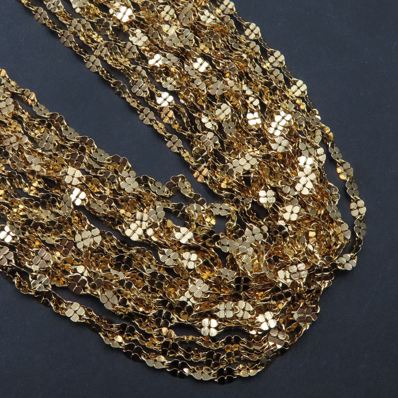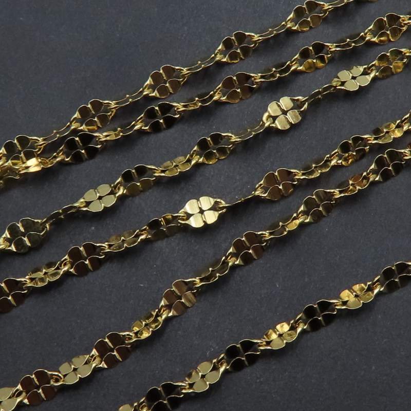 Subtelny łańcuszek ze srebra złoconego w odcieniu ciepłego złota, z dekoracyjnym motywem „kwiatków”. Drobne, regularnie rozmieszczone elementy ozdobne nadają całości lekkości i biżuteryjnego charakteru, dzięki czemu łańcuszek prezentuje się elegancko także bez dodatkowych zawieszek.