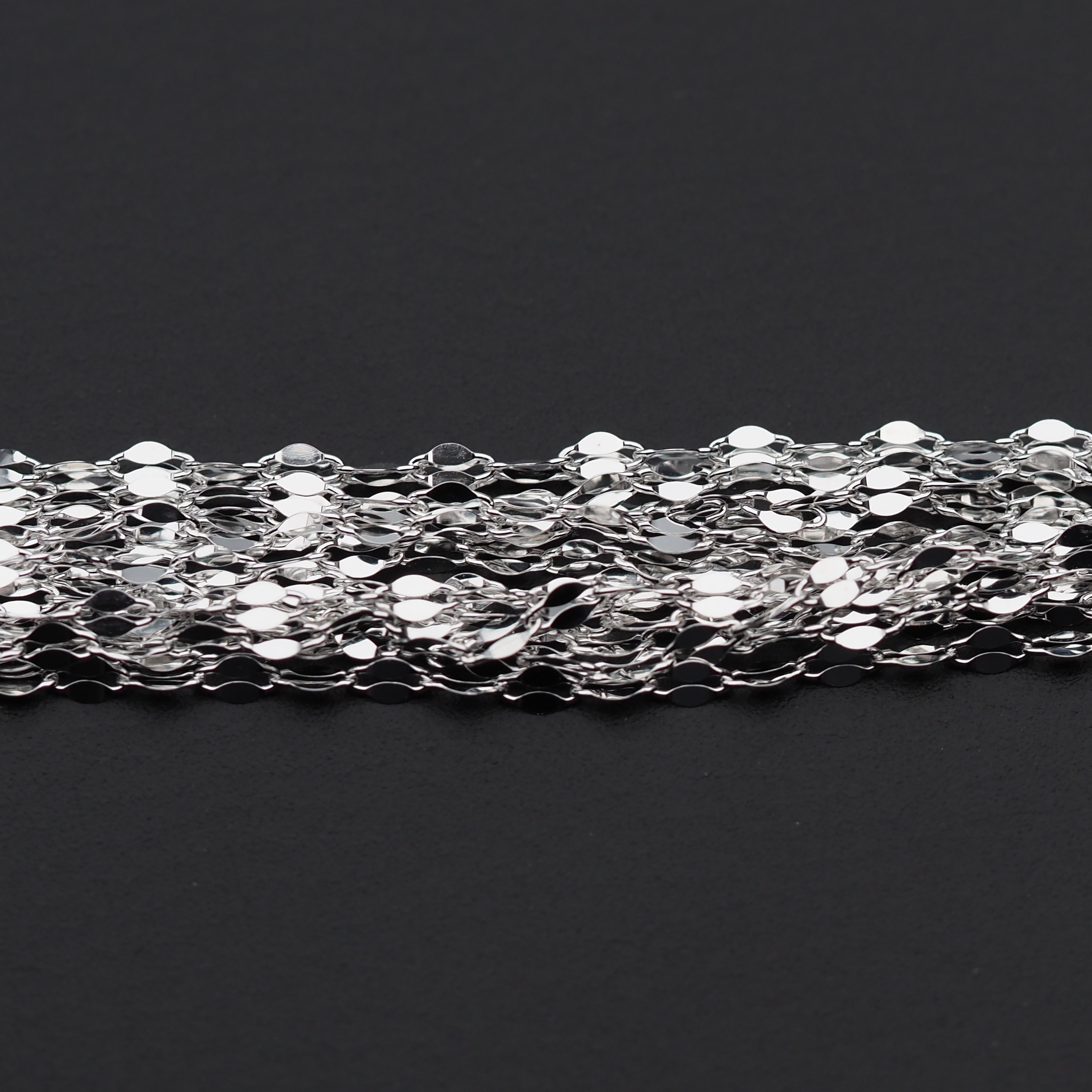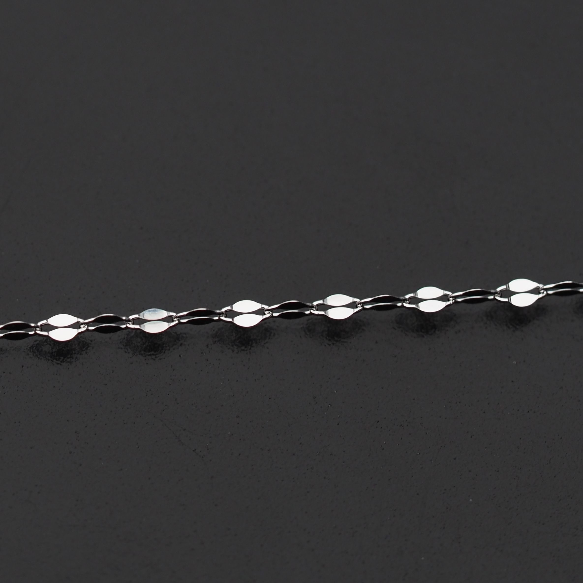 Delikatny łańcuszek w kolorze srebra, o drobnym i równym charakterze ogniw. Subtelna szerokość splotu sprawia, że całość wygląda lekko i elegancko, a proporcje oczek dobrze wpisują się w estetykę minimalistycznych projektów.