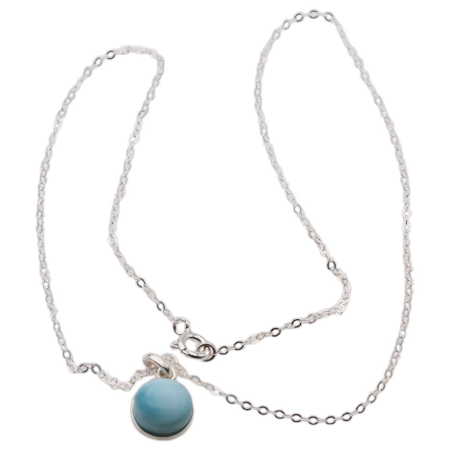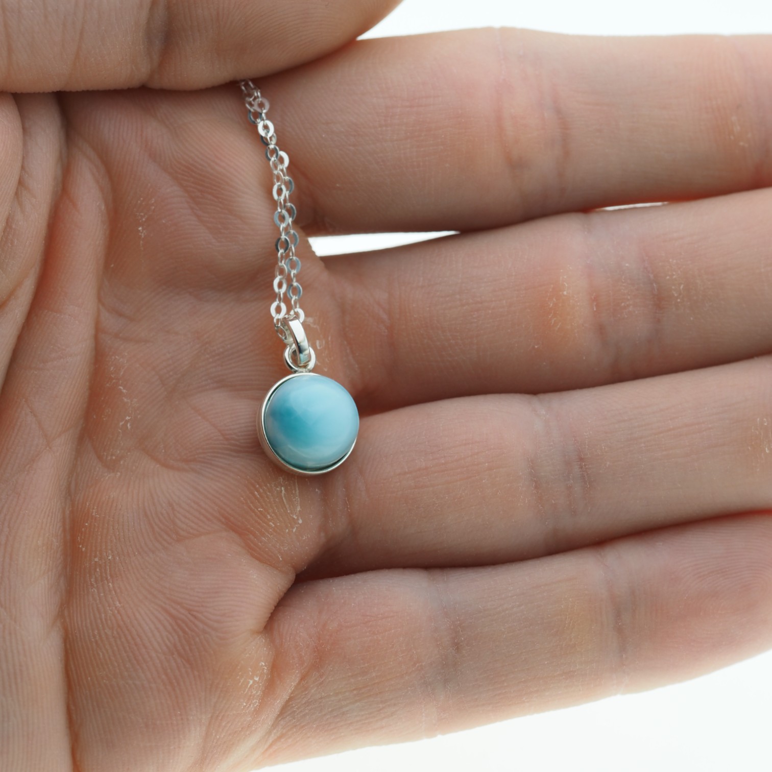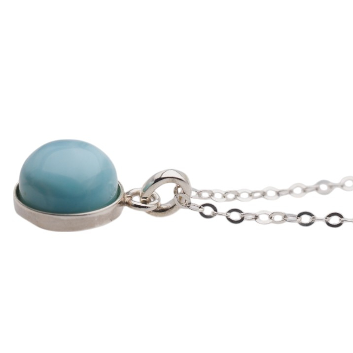 Subtelny naszyjnik z okrągłą zawieszką wykonaną z larimaru w srebrnej oprawie. Kamień wyróżnia się jasną, chłodną kolorystyką i charakterem naturalnego minerału, a srebro próby 925 nadaje całości eleganckie, jubilerskie wykończenie.