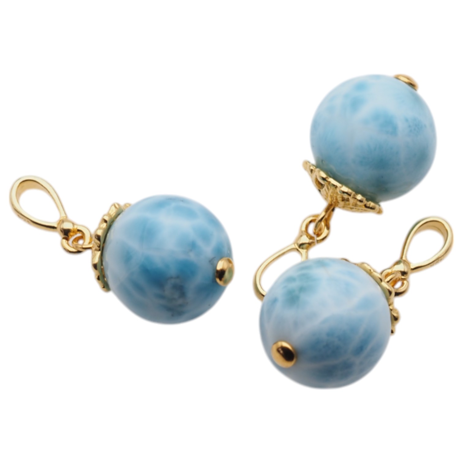 Wisiorek z larimarem w formie gładkiej kulki zachwyca jasnoniebieskim odcieniem, kojarzącym się z wodą i spokojem. Kamień naturalny osadzono w srebrnej oprawie, a złocenie 24K nadaje całości elegancki, ciepły akcent.