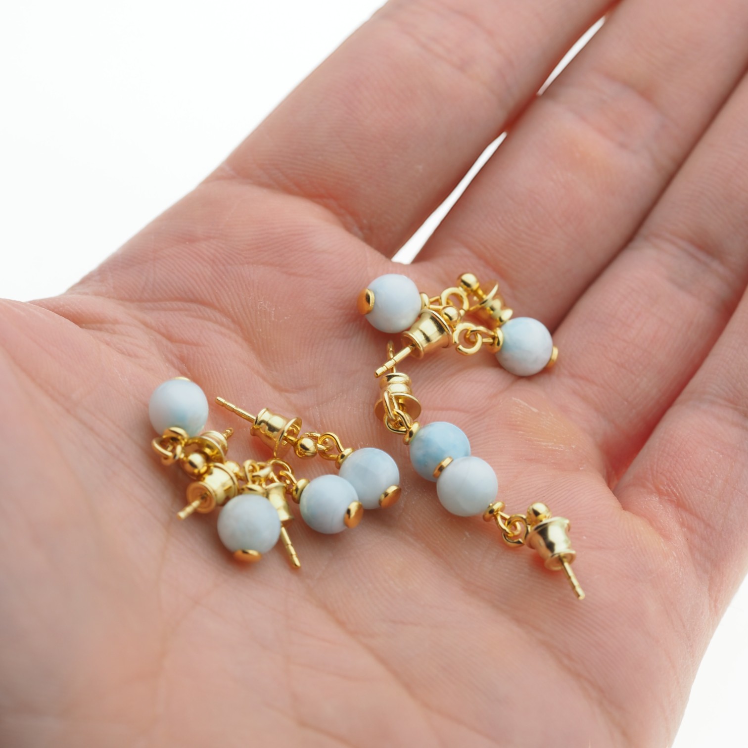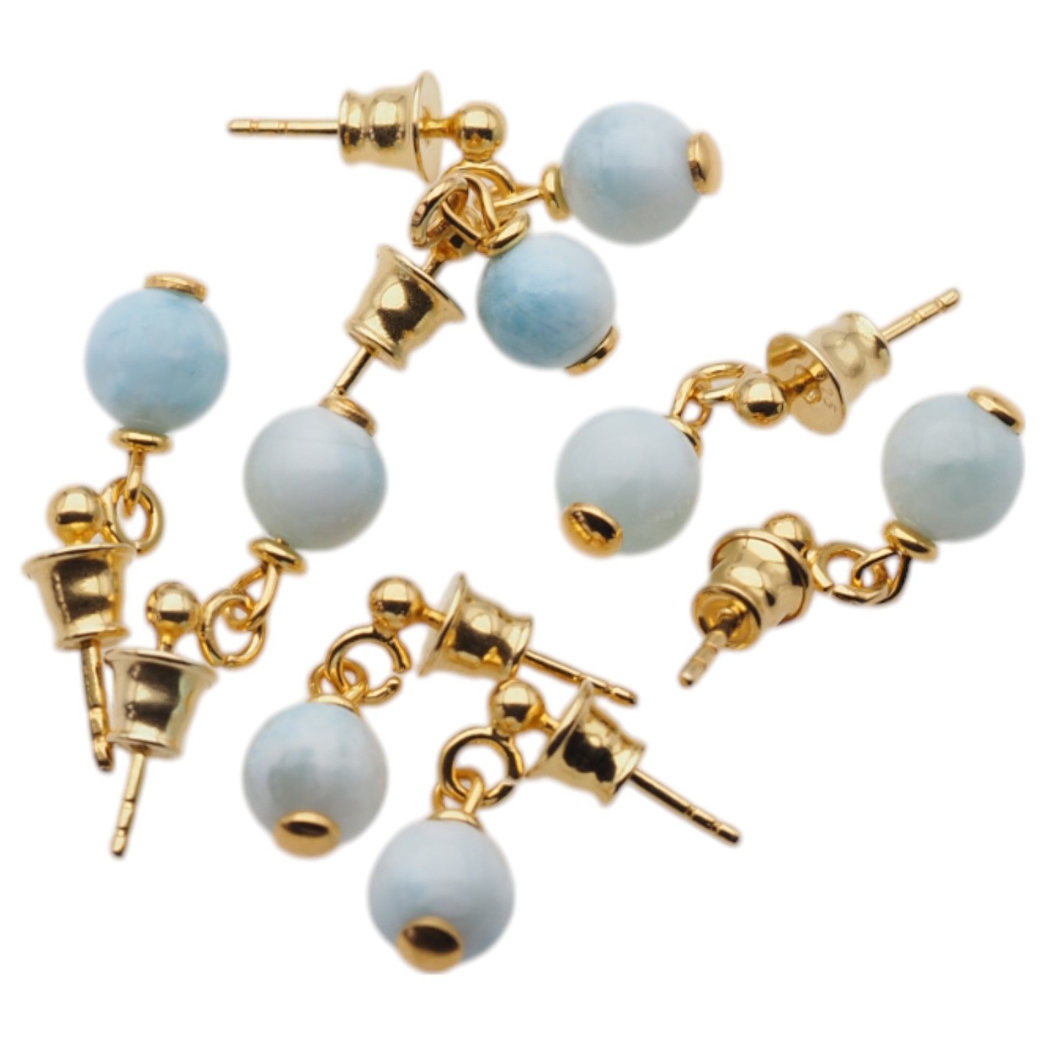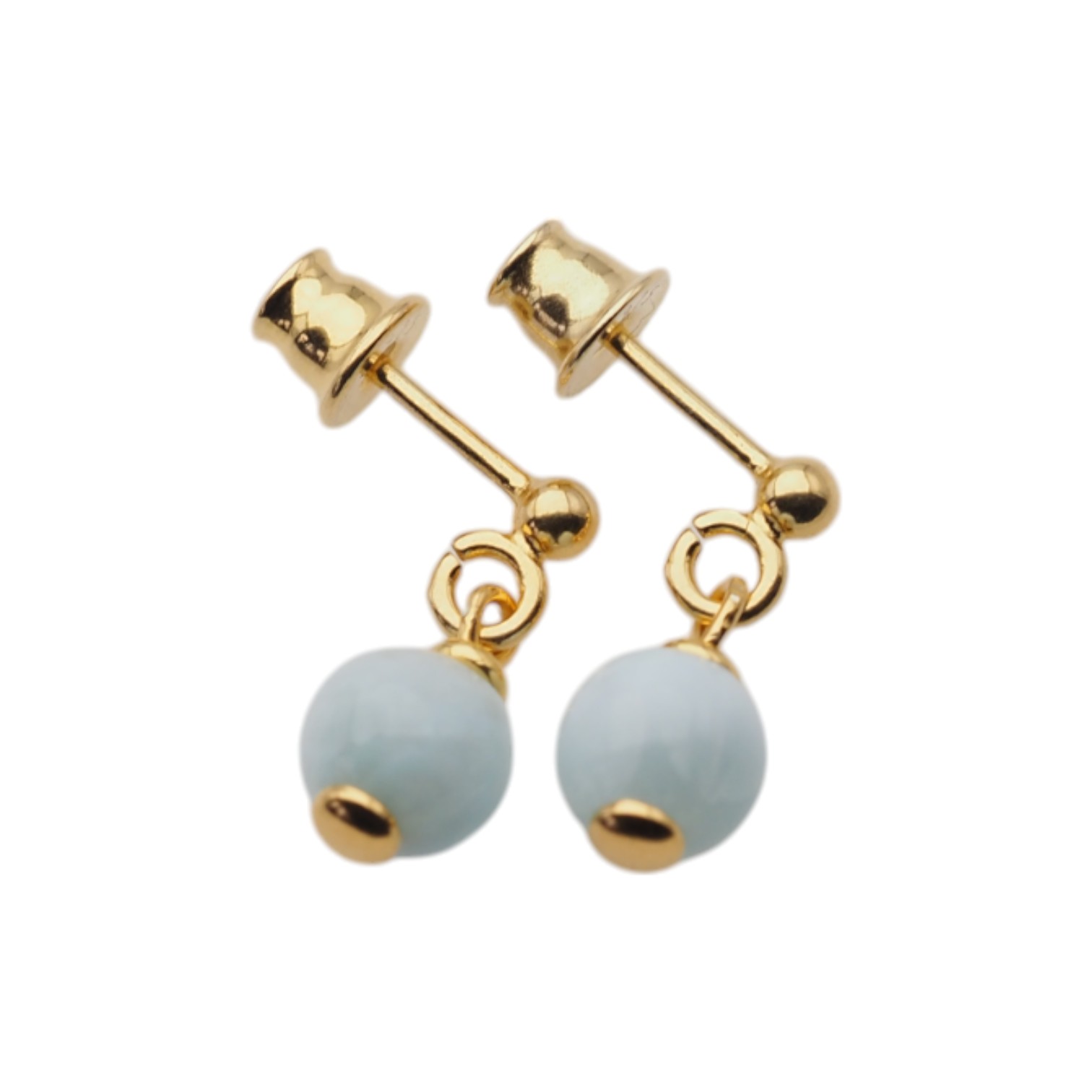 Te delikatne kolczyki z larimarem mają formę drobnych, naturalnych kamieni w kształcie kulki, osadzonych w srebrnej oprawie. Jasny, morski odcień larimaru pięknie współgra ze szlachetnym blaskiem srebra złoconego 24K, tworząc elegancki, a jednocześnie lekki i świeży charakter biżuterii.