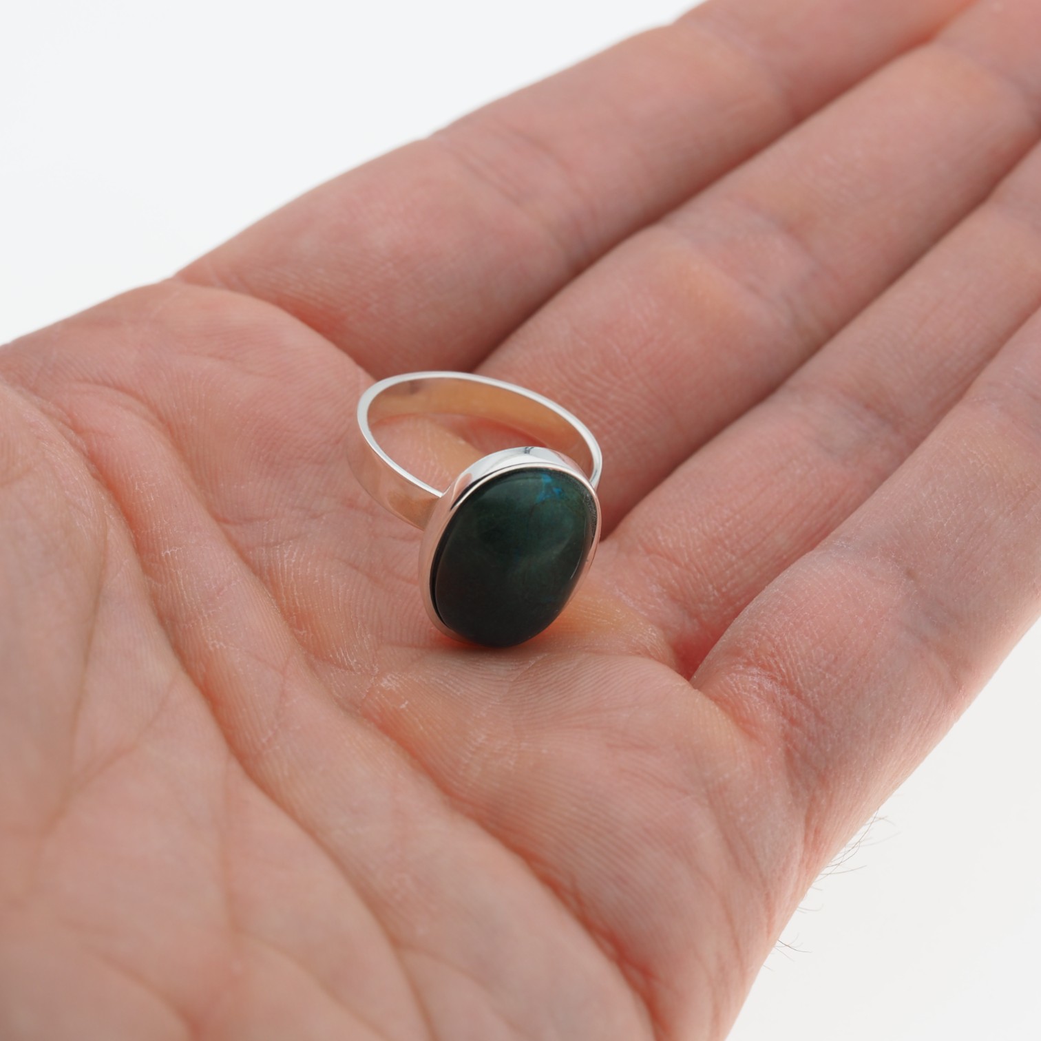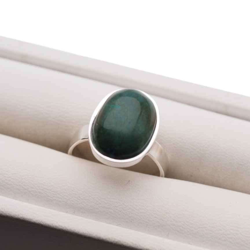 Pierścionek z naturalną chryzokolą w owalnym kształcie zachwyca spokojną, mineralną kolorystyką i wyrazistym rysunkiem kamienia. Całość osadzona jest w srebrnej oprawie, co podkreśla elegancki, a jednocześnie naturalny charakter biżuterii.