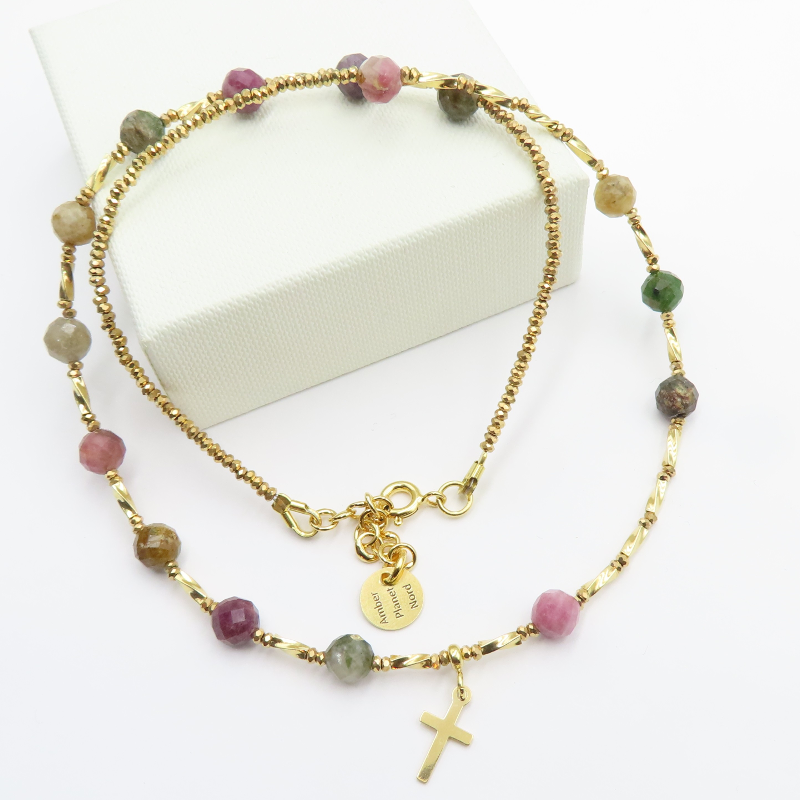 Naszyjnik Turmalin Kolorowy i Hematyt srebrze złoconym.