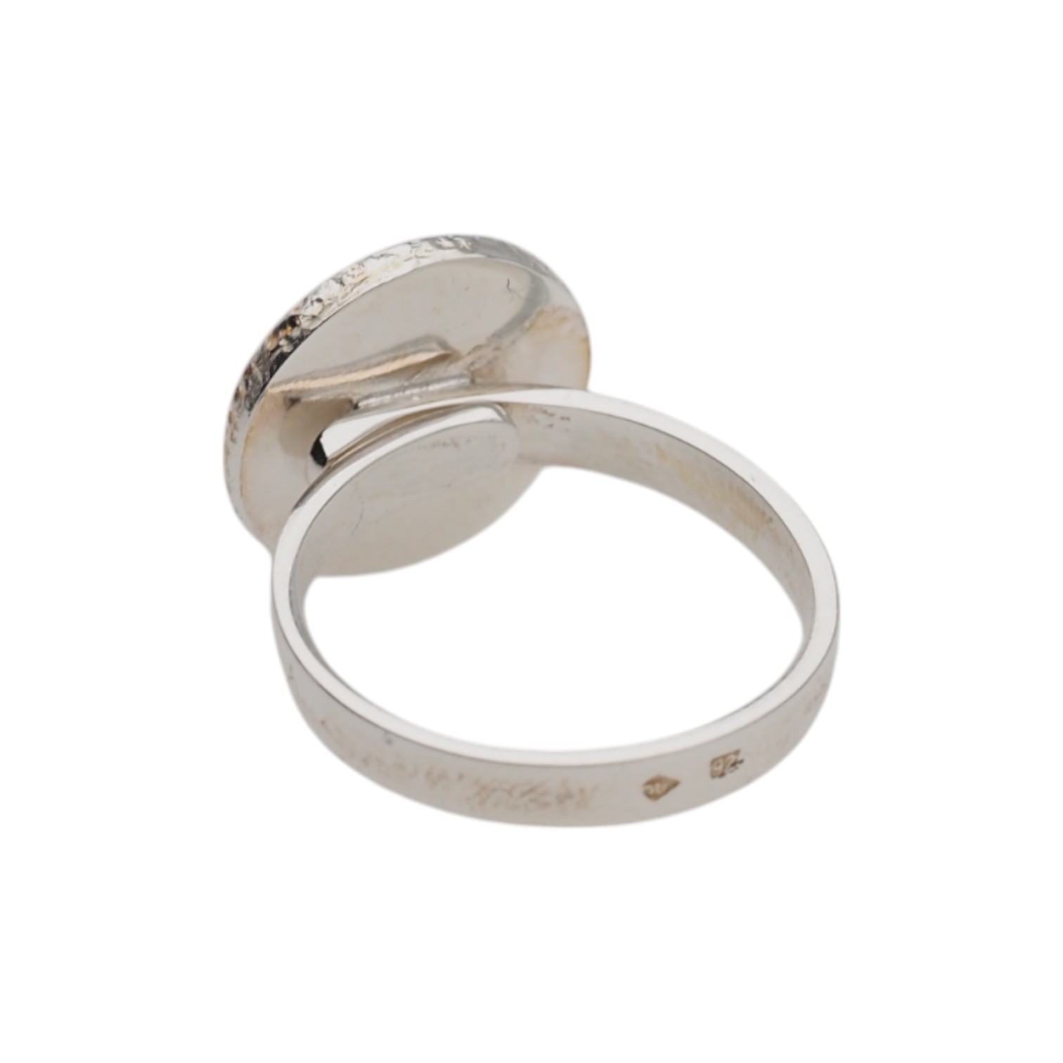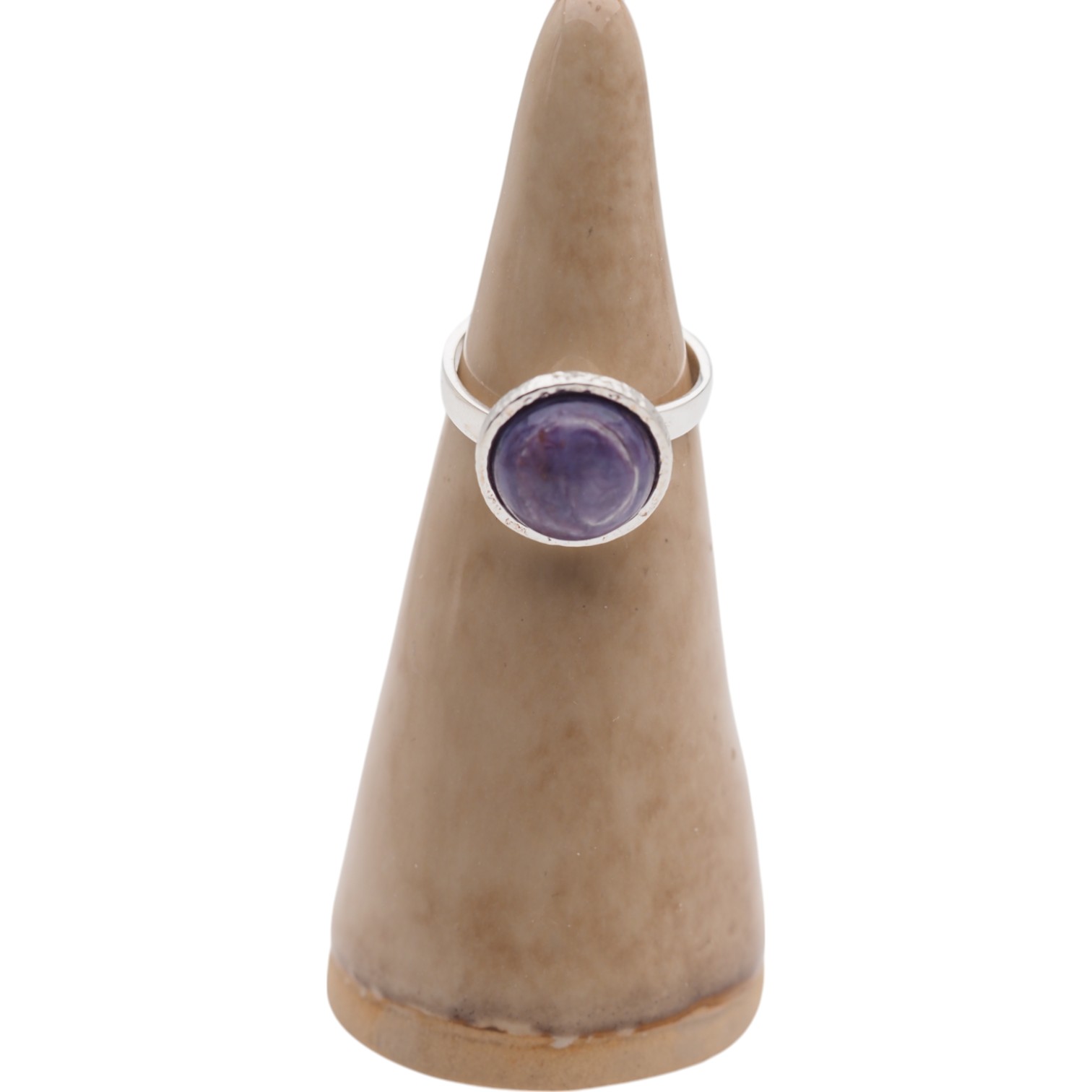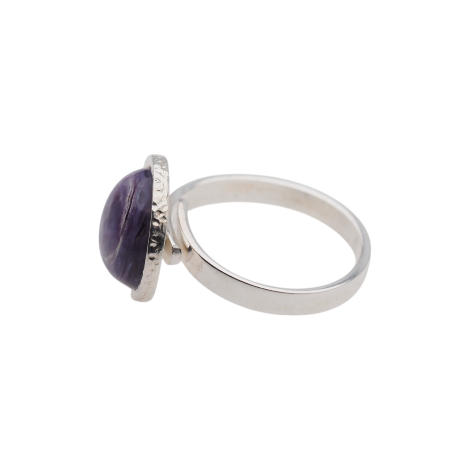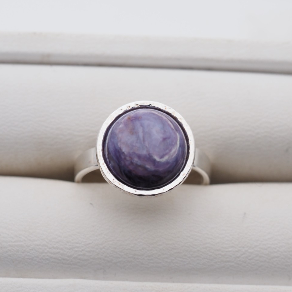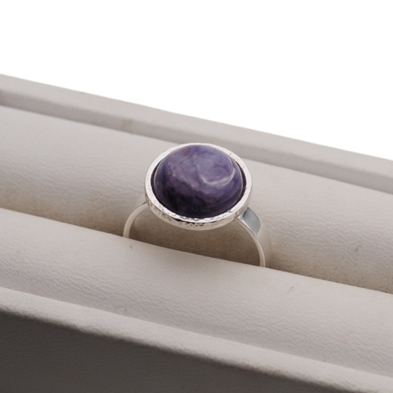 Ręcznie wykonany pierścionek z naturalnym czaroitem zachwyca intensywną, fioletową tonacją i charakterystycznym, „mglisto-żyłkowanym” rysunkiem minerału. Okrągły kamień osadzono w srebrnej oprawie, a młotkowane wykończenie srebra dodaje całości szlachetnej faktury i podkreśla rzemieślniczy charakter biżuterii.