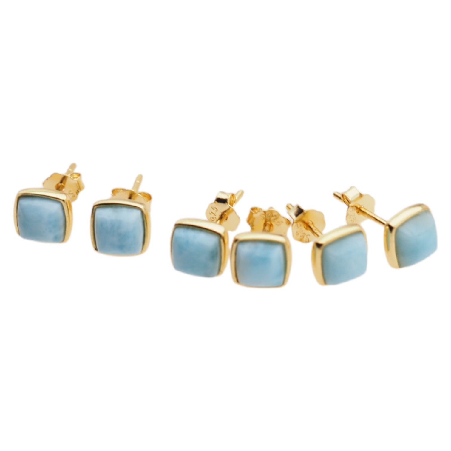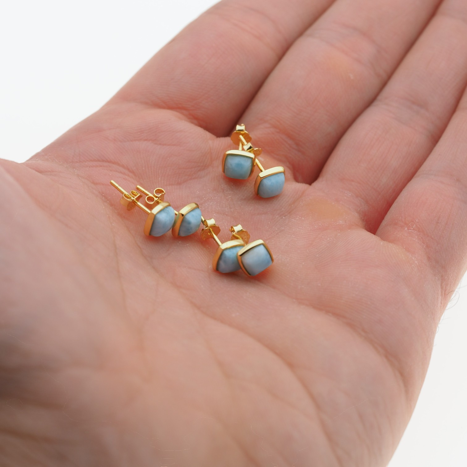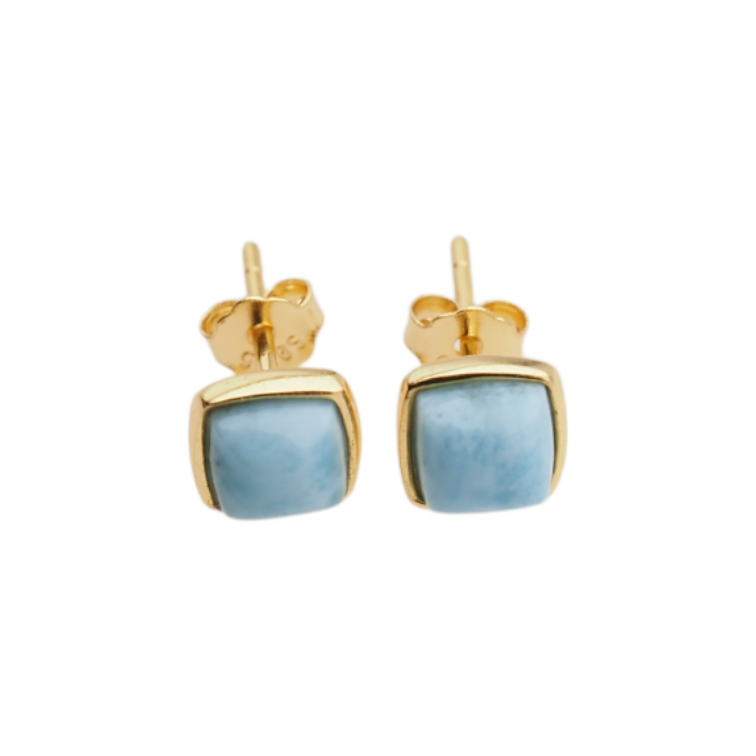 Te kolczyki sztyfty przyciągają wzrok naturalnym, niebieskim larimarem w geometrycznej formie kwadratu. Kamień osadzono w srebrnej oprawie ze srebra złoconego próby 925, co daje elegancki, a jednocześnie świeży efekt – idealny dla osób lubiących biżuterię subtelną, ale wyrazistą.