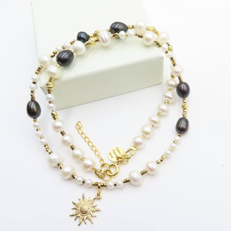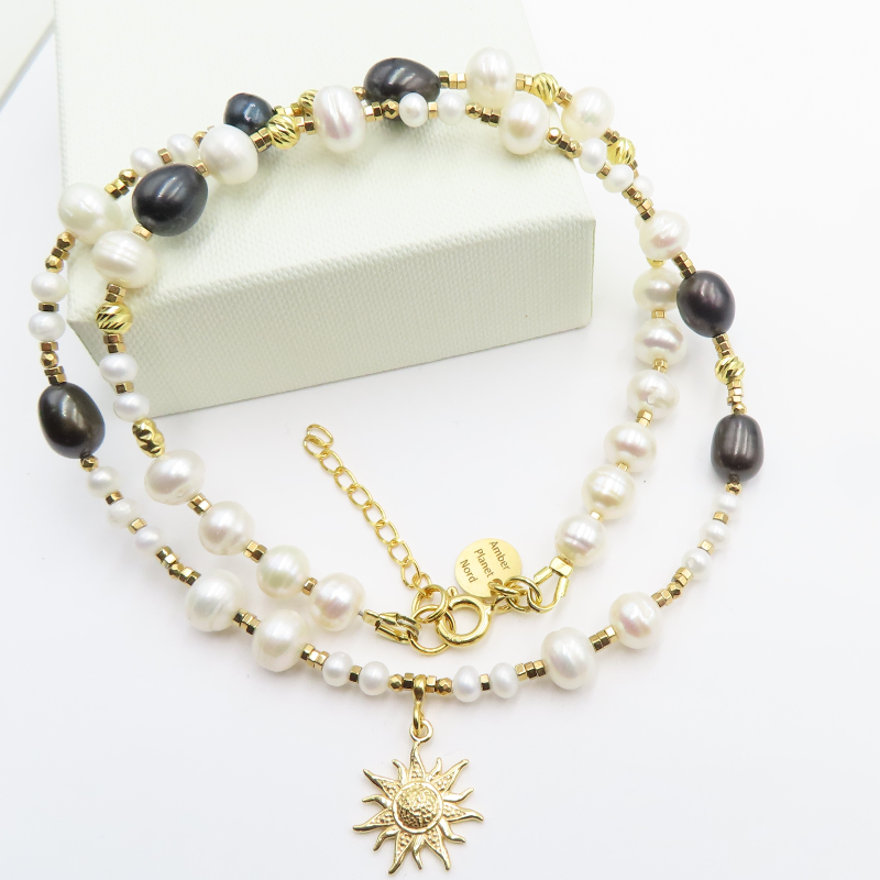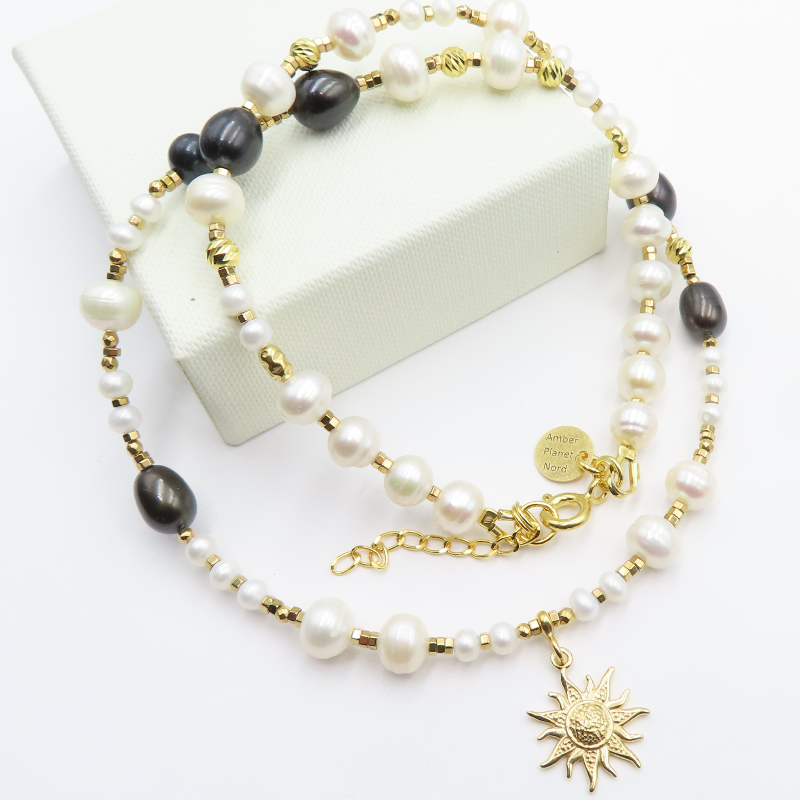 Delikatny naszyjnik z naturalnymi perłami i hematytami w oprawie ze srebra złoconego 24K (próba 925) łączy jasny, perłowy połysk z chłodniejszym, metalicznym akcentem kamienia. Całość ma elegancki, nowoczesny charakter i wygląda lekko na szyi.