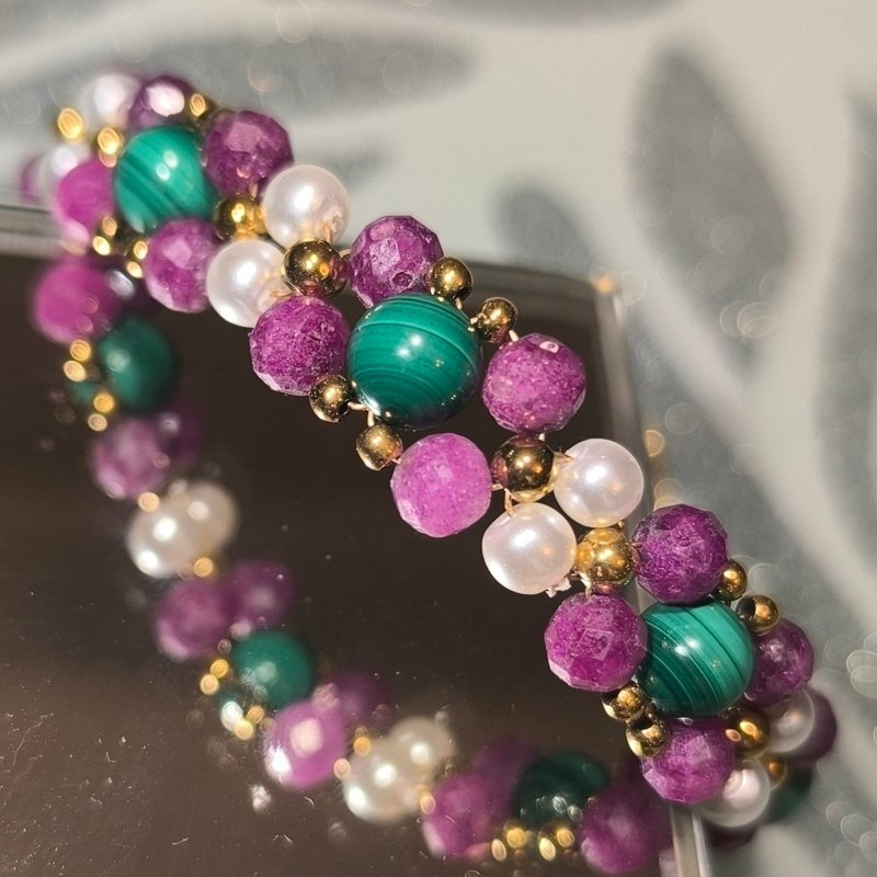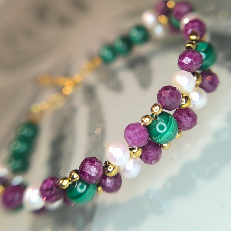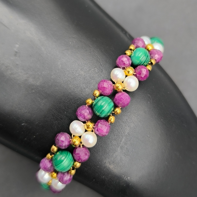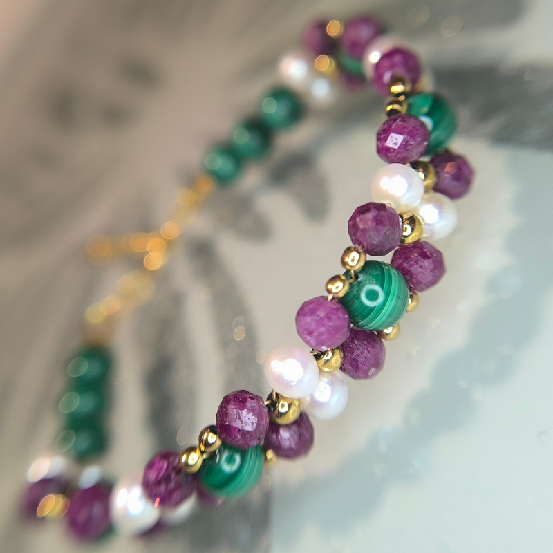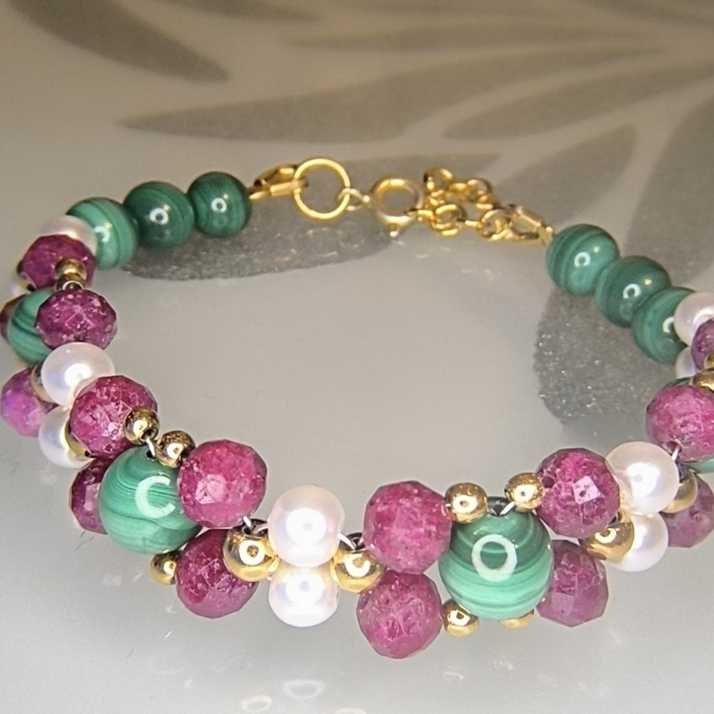 Bransoletka pleciona z efektownym miksem kamieni: rubinu, malachitu, perły oraz złoconego hematytu. Zestawienie głębokiej czerwieni, soczystej zieleni i perłowej jasności tworzy elegancki, a jednocześnie naturalny charakter, podkreślony detalami w srebrze złoconym 24K.