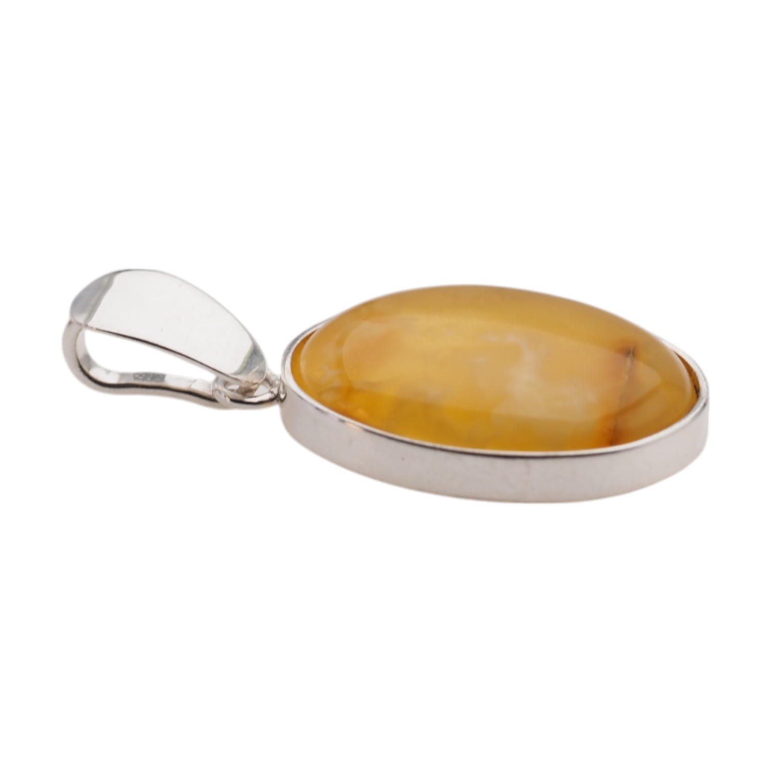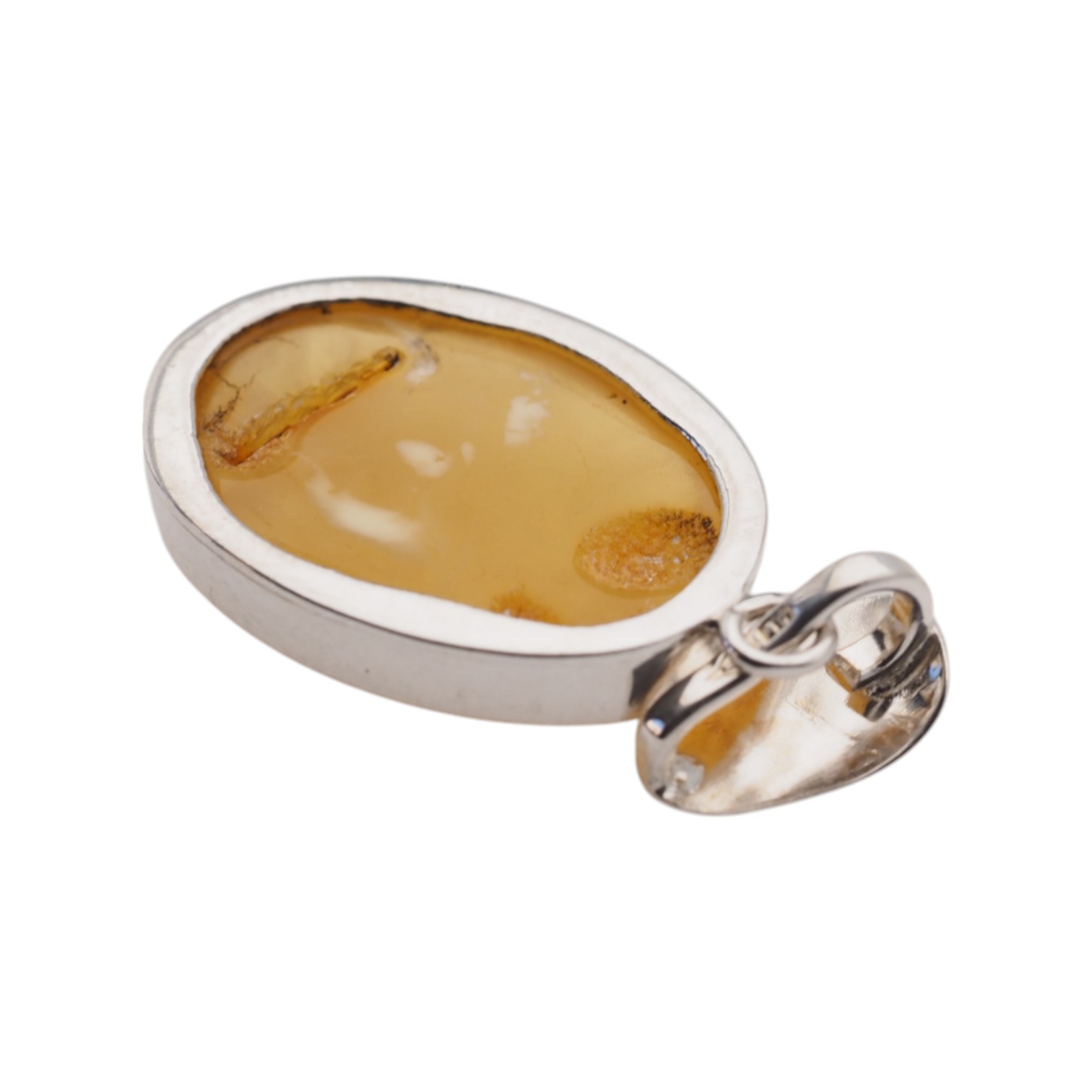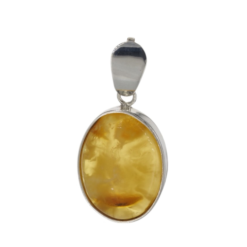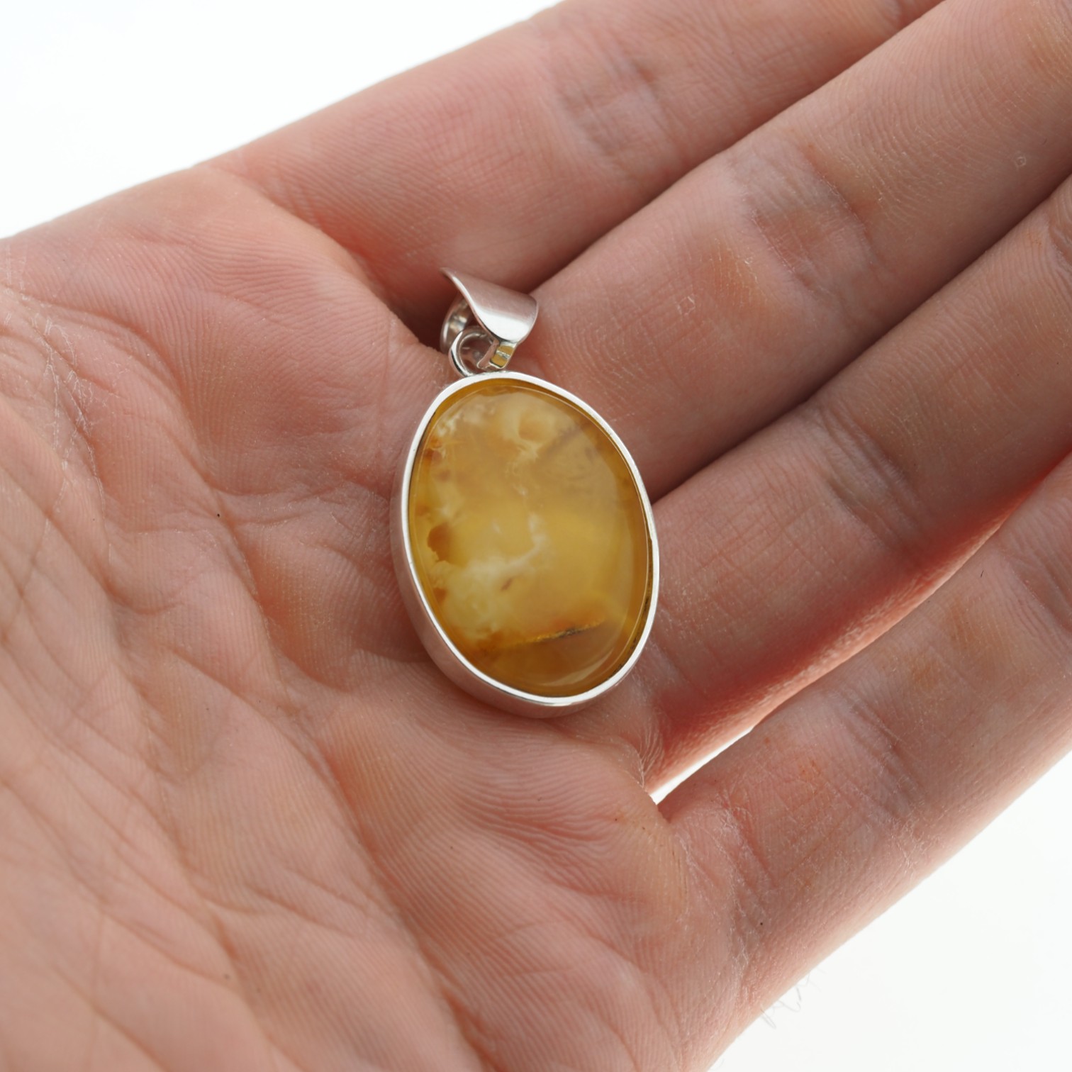 Ręcznie wykonana zawieszka z bursztynem mleczno-przezroczystym zachwyca subtelną grą światła i naturalnym rysunkiem żywicy. Owalny kamień z bałtyckiego bursztynu został osadzony w srebrnej oprawie, która podkreśla jego jasną, miękką tonację i nadaje całości elegancki, jubilerski charakter.