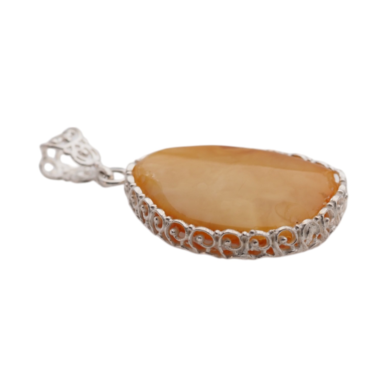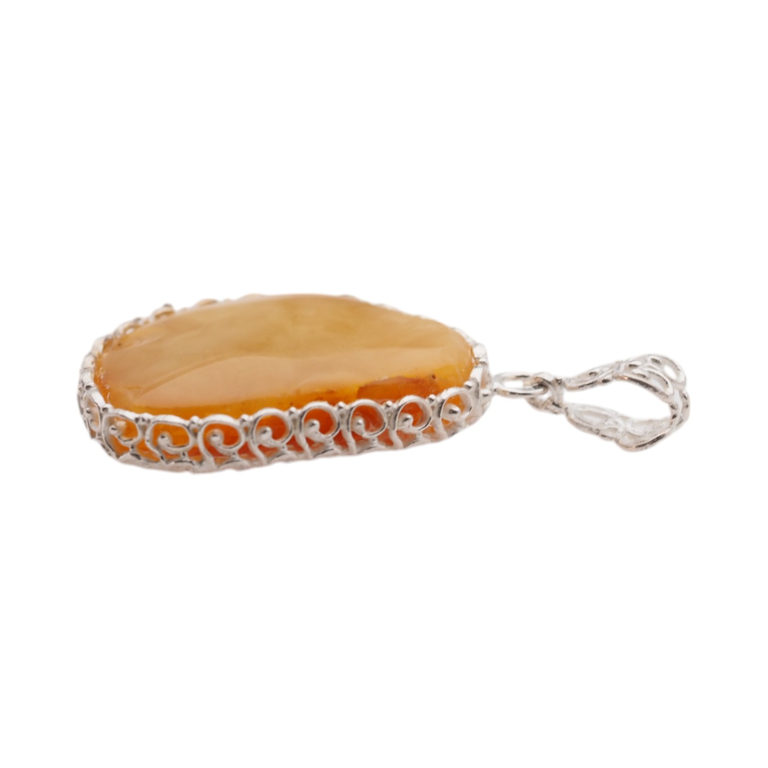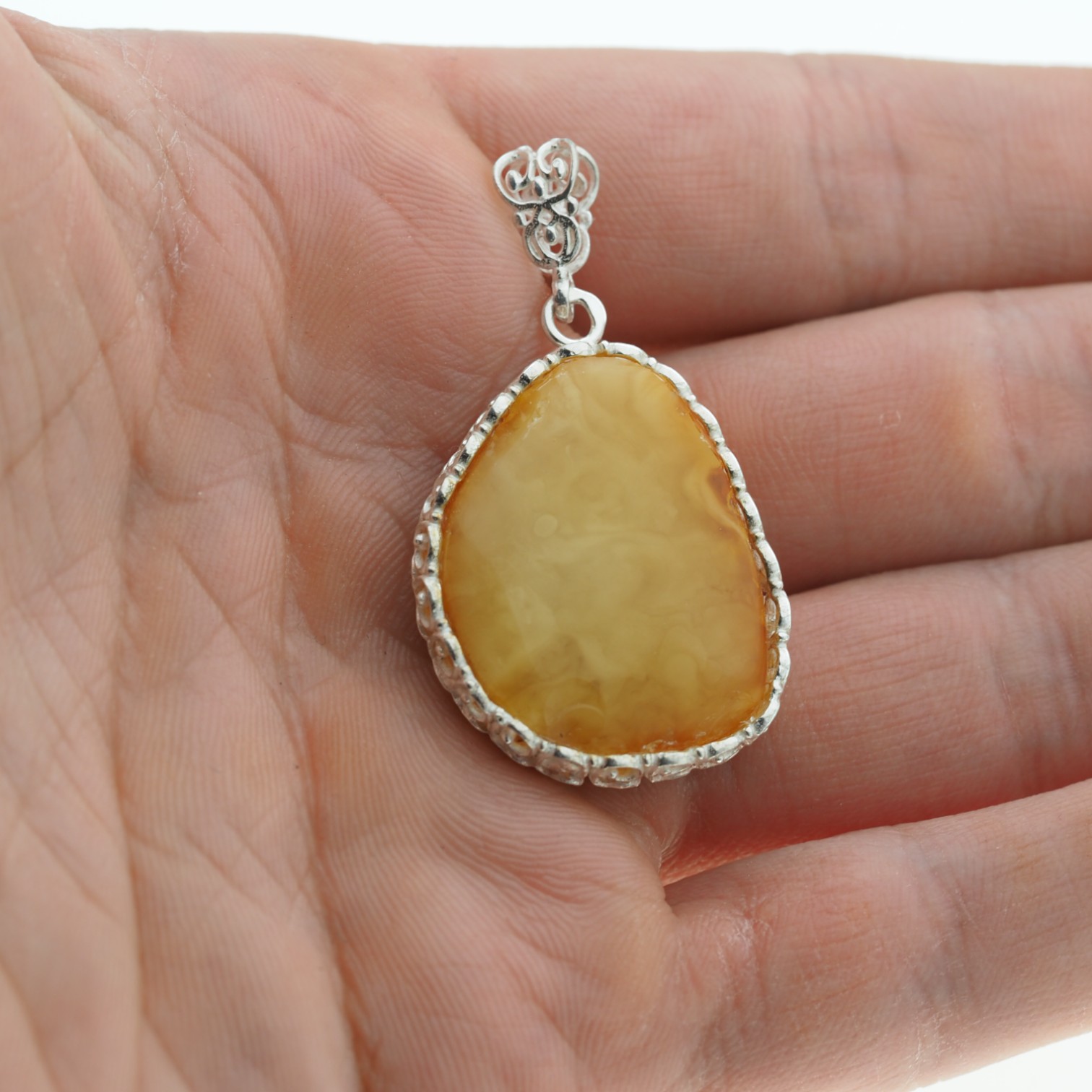 Ręcznie wykonana zawieszka z surowym bursztynem mlecznym zachwyca naturalną, nieregularną formą i subtelną, jasną barwą. Kamień jest częściowo polerowany, dzięki czemu łączy matowość surowej bryłki z delikatnym połyskiem wygładzonych fragmentów. Całość osadzono w srebrnej oprawie, która podkreśla organiczny charakter bursztynu i nadaje biżuterii szlachetne wykończenie.