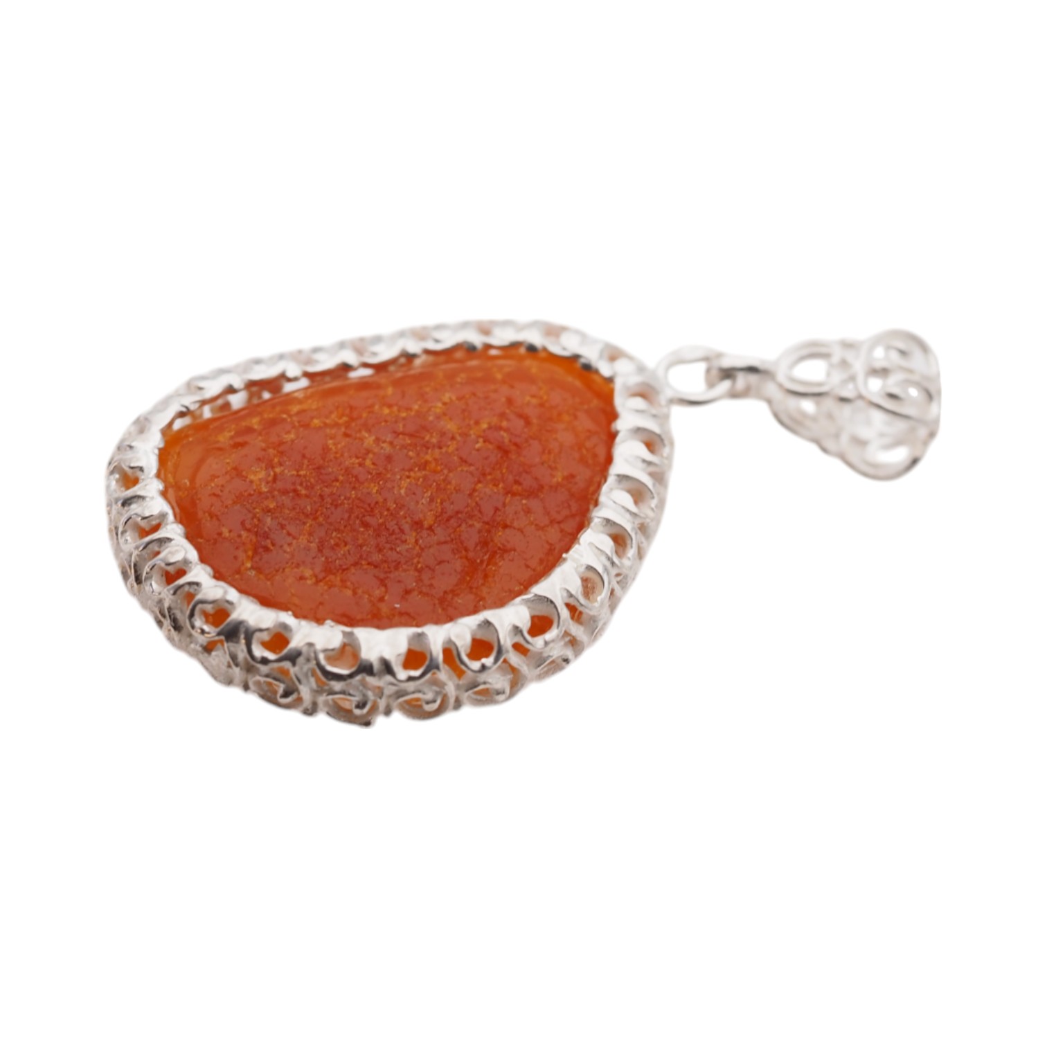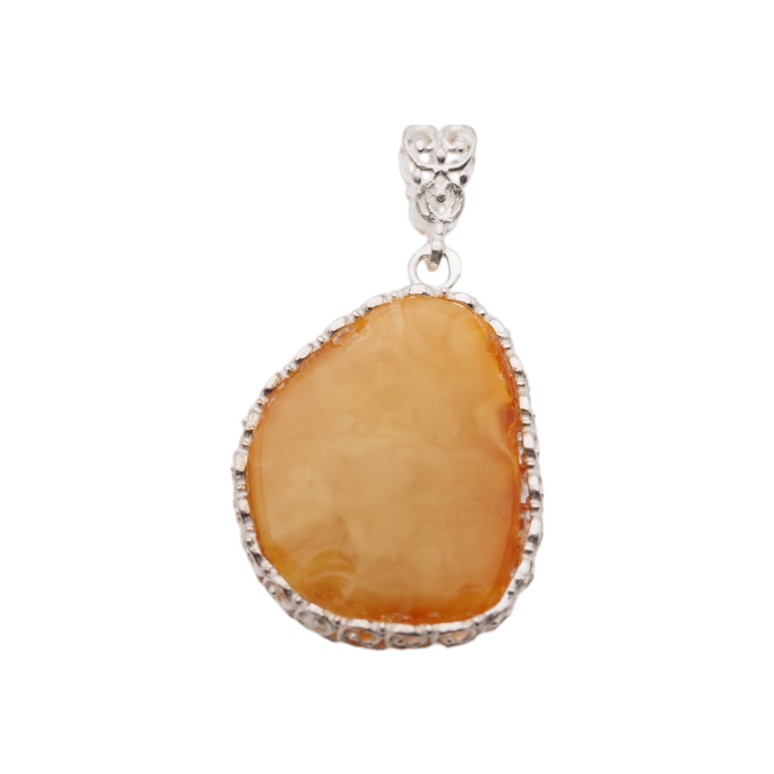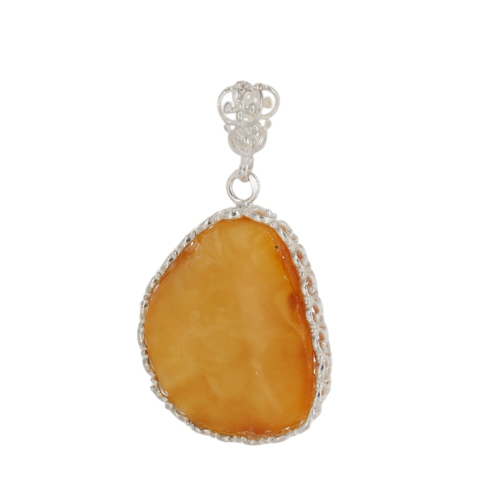 Ręcznie wykonana zawieszka z surowym bursztynem mlecznym zachwyca naturalną, nieregularną formą i subtelną, jasną barwą. Kamień jest częściowo polerowany, dzięki czemu łączy matowość surowej bryłki z delikatnym połyskiem wygładzonych fragmentów. Całość osadzono w srebrnej oprawie, która podkreśla organiczny charakter bursztynu i nadaje biżuterii szlachetne wykończenie.
